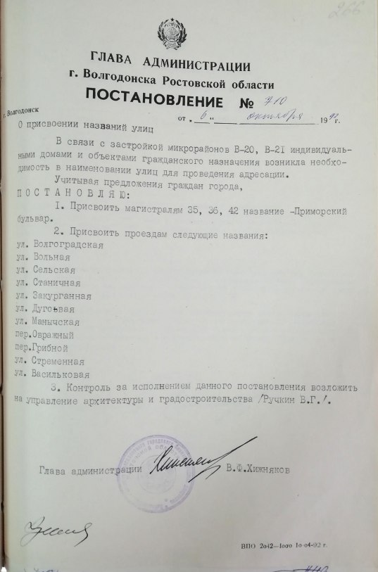 6 октября 1992 года постановлением Администрации города улицам присвоены названия. Согласно документу появились бульвар Приморский, улицы Волгоградская, Вольная, Сельская, Станичная, Закурганная, Дуговая, Манычская, Стременная, Васильковая, переулок Овражный, Грибной.