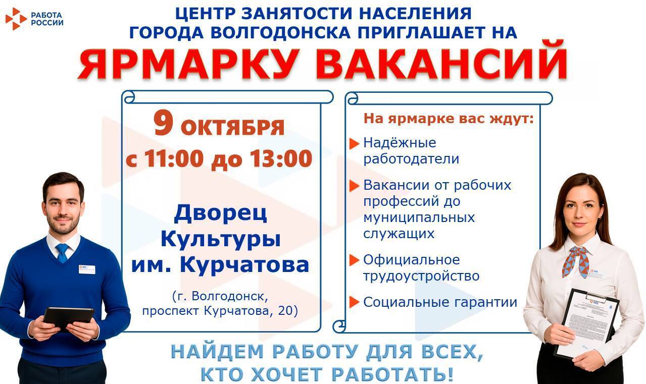 9 октября 2025 года, с 11:00 до 13:00, Центр занятости населения проведет ярмарку вакансий.