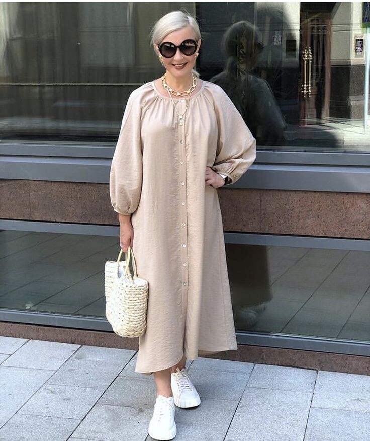 - Бежевое платье-рубашка длины макси: Свободный крой и подвернутые рукава дарят комфорт. Элегантные замшевые балетки добавляют изюминку. Такой образ прекрасно подчеркивает женственность.