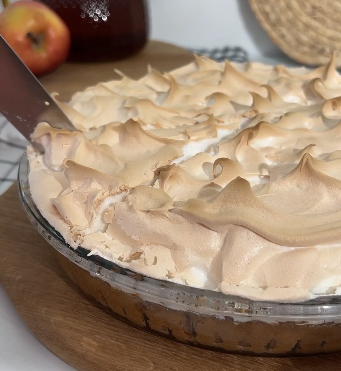 Пока пирог выпекается, пора заняться безе. В глубокой миске взбейте 3 белка до образования легкой пены, постепенно добавляя 150 г сахара и лимонный сок. Продолжайте взбивать, пока масса не станет гуще и не образует стойкие пики.