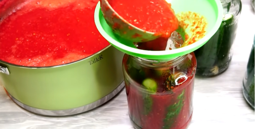 Приготовьте томаты, прокрутив их через мясорубку. Перелейте в кастрюлю и добавьте соль и сахар, тщательно перемешивая. Пока заливка готовится, налейте кипящую воду в банку с огурцами, накройте крышкой и оставьте на время приготовления заливки. Как только загустеет заливка, добавьте уксус, перемешайте и залейте в банки с огурцами. Накройте стерилизованными крышками и оставьте перевернутыми до полного остывания.