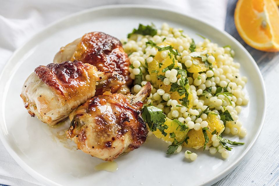 Очистите апельсин, разбейте на дольки и уберите избыточную белую пленку. Мелко нарежьте кинзу и петрушку. Когда птитим будет готов, перемешайте его с оливковым маслом, апельсином, зеленью. Подавайте на стол, выкладывая птитим и цыплёнка вместе.