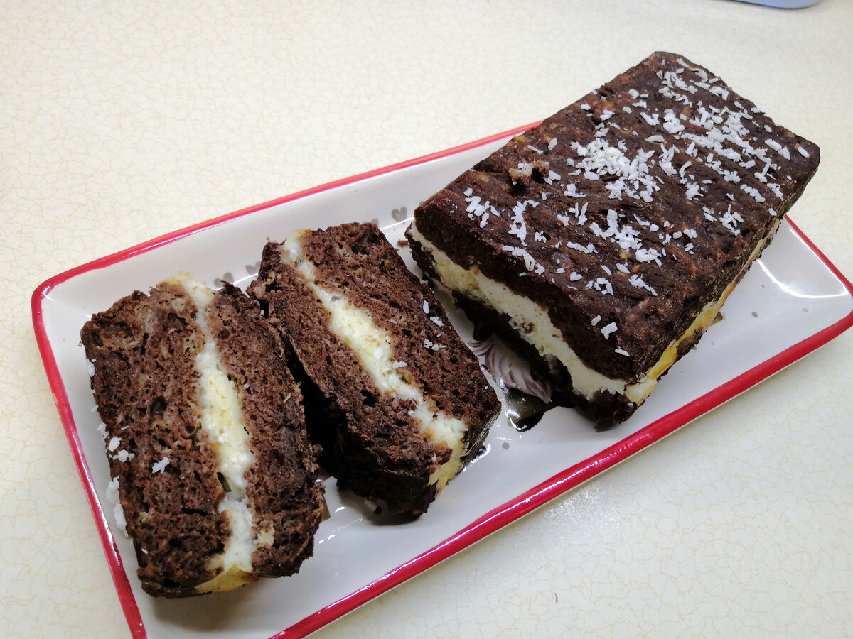 Приготовленное тесто делится на две части. В форму для выпекания выкладывается первая половина кексового теста, затем в центр аккуратно выложить творожную начинку и сверху закрыть оставшимся тестом. Выпекать десерт следует в предварительно разогретой до 180 градусов духовке в течение 35-40 минут — время может варьироваться в зависимости от особенностей вашей техники. Порадуйте себя и своих близких домашним десертом, который украсит любой стол!
