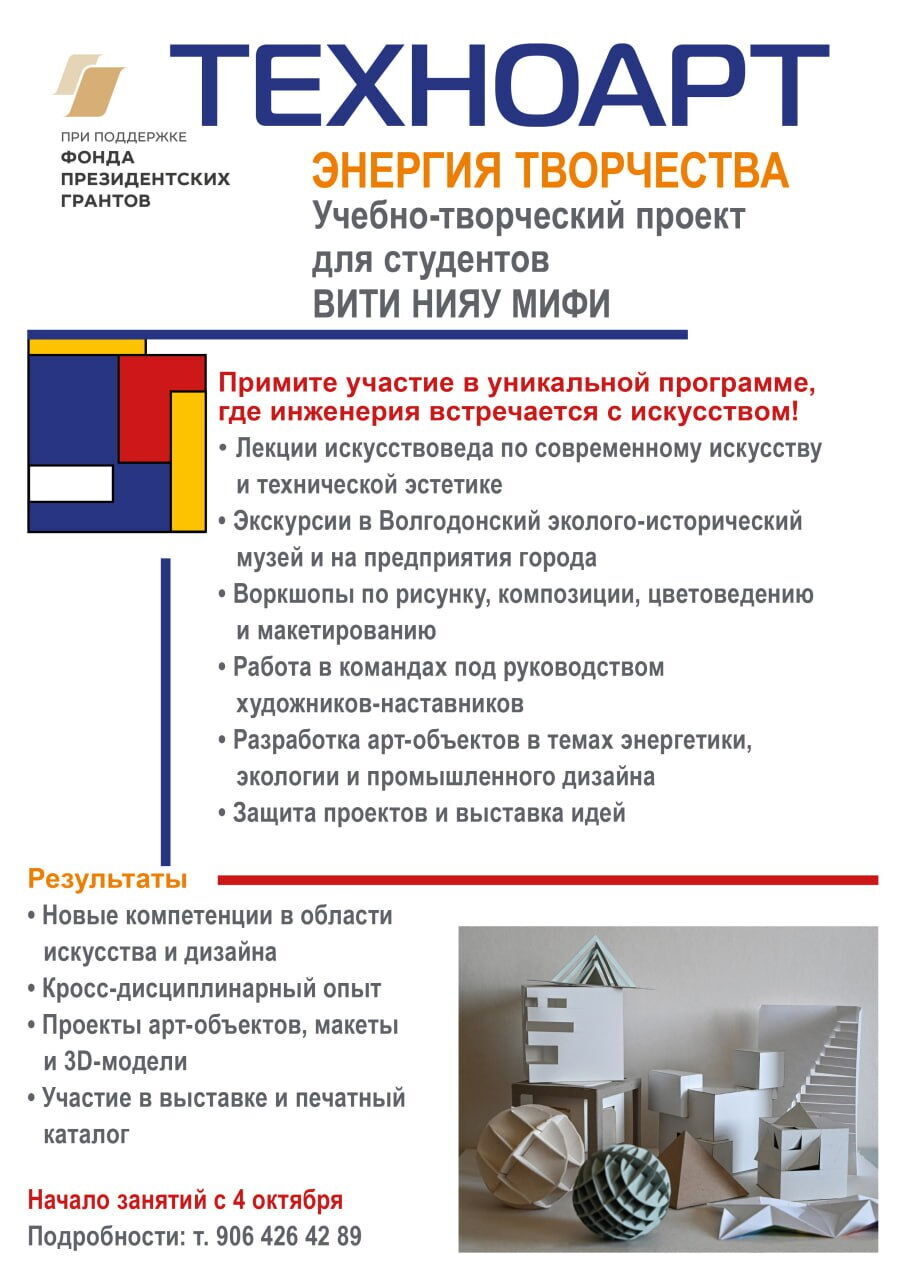 В Волгодонском инженерно-техническом институте НИЯУ МИФИ дан старт новому образовательному проекту «ТехноАрт. Энергия творчества». Инициатива нацелена на развитие творческих компетенций у студентов, интегрируя технологии, искусство и инженерное мышление.