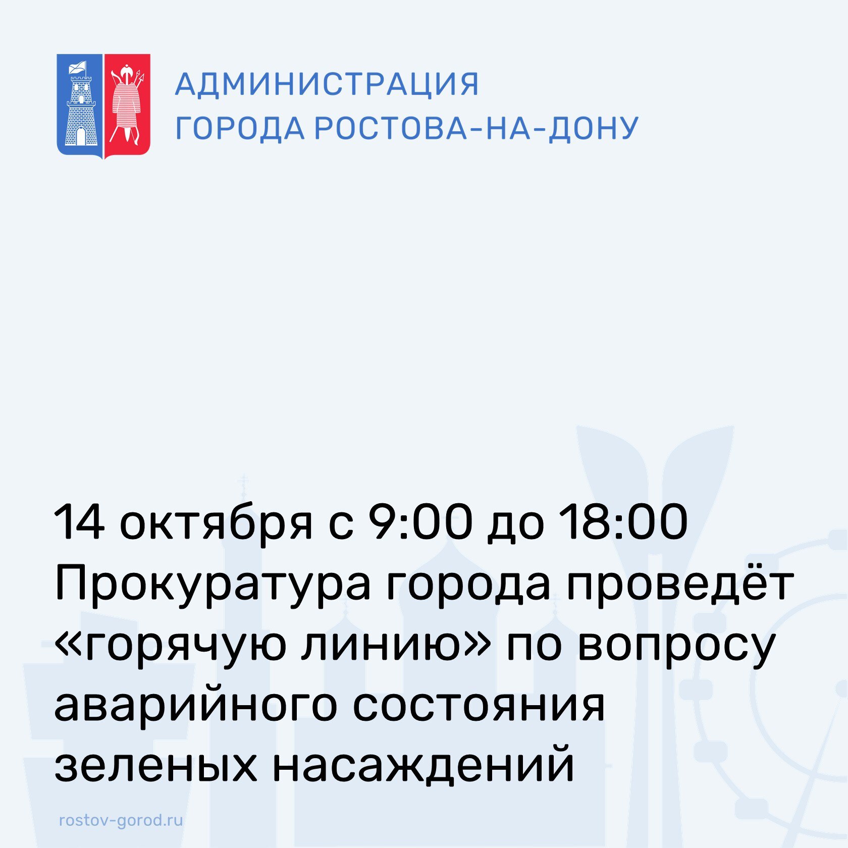 Прокуратура города Ростова-на-Дону 14 октября проведет «горячую линию» по вопросу аварийного состояния зеленых насаждений на территории города Ростова-на-Дону. Граждане могут обратиться с 09:00 до 18:00 (перерыв с 13:00 до 13:45) по телефону 8-961-419-72-77 с интересующими вопросами в указанной сфере.