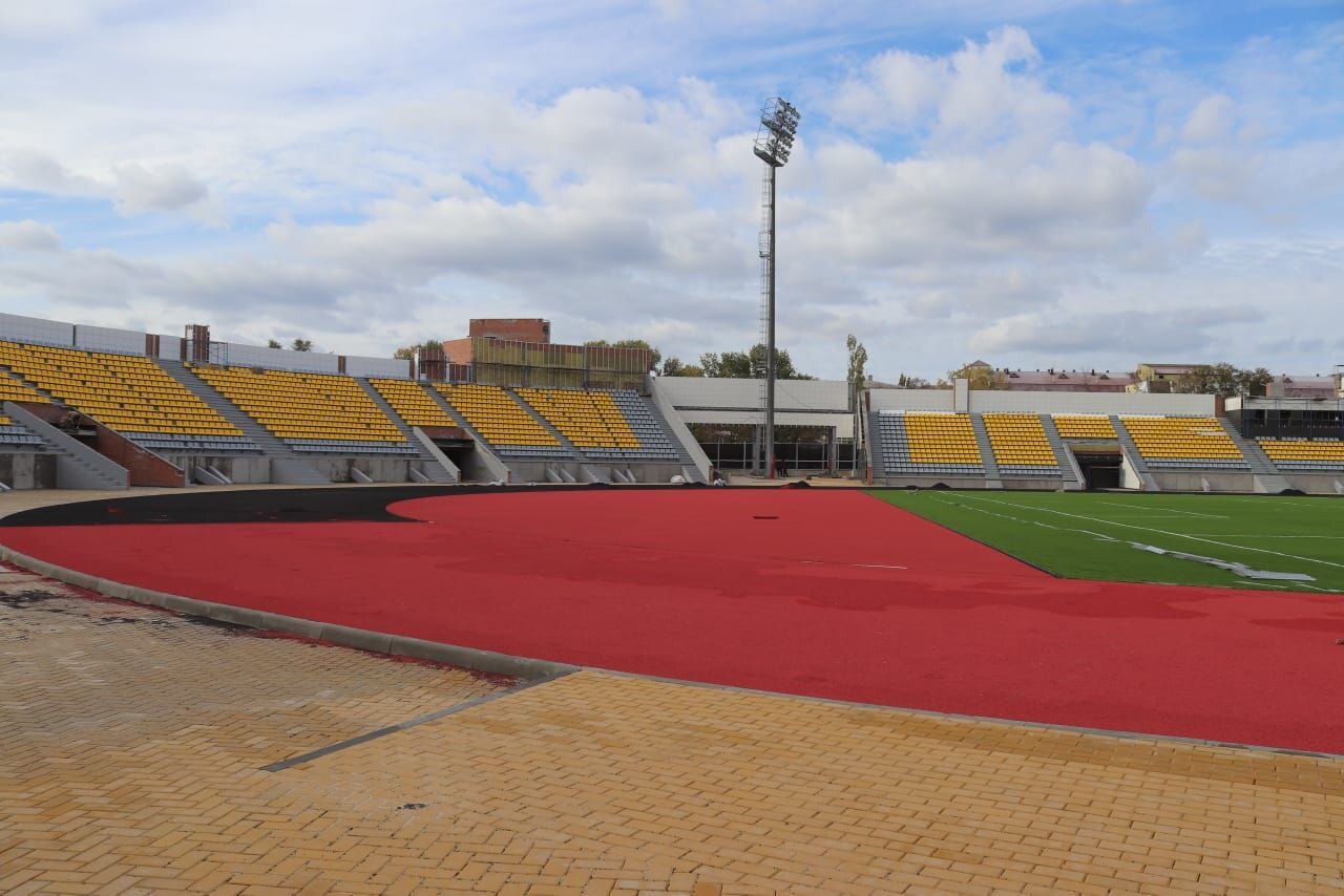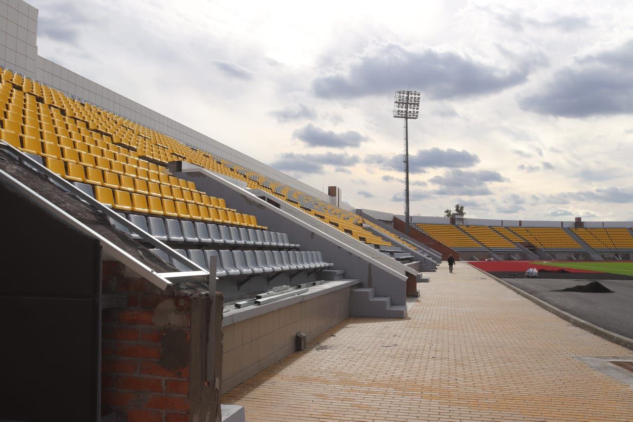 Сегодня на стадионе трудится 60 человек: продолжается обустройство слоев покрытия беговых дорожек и легкоатлетических секторов, завершён монтаж сидений трибун, смонтированы шумозащитные экраны по периметру стадиона.
