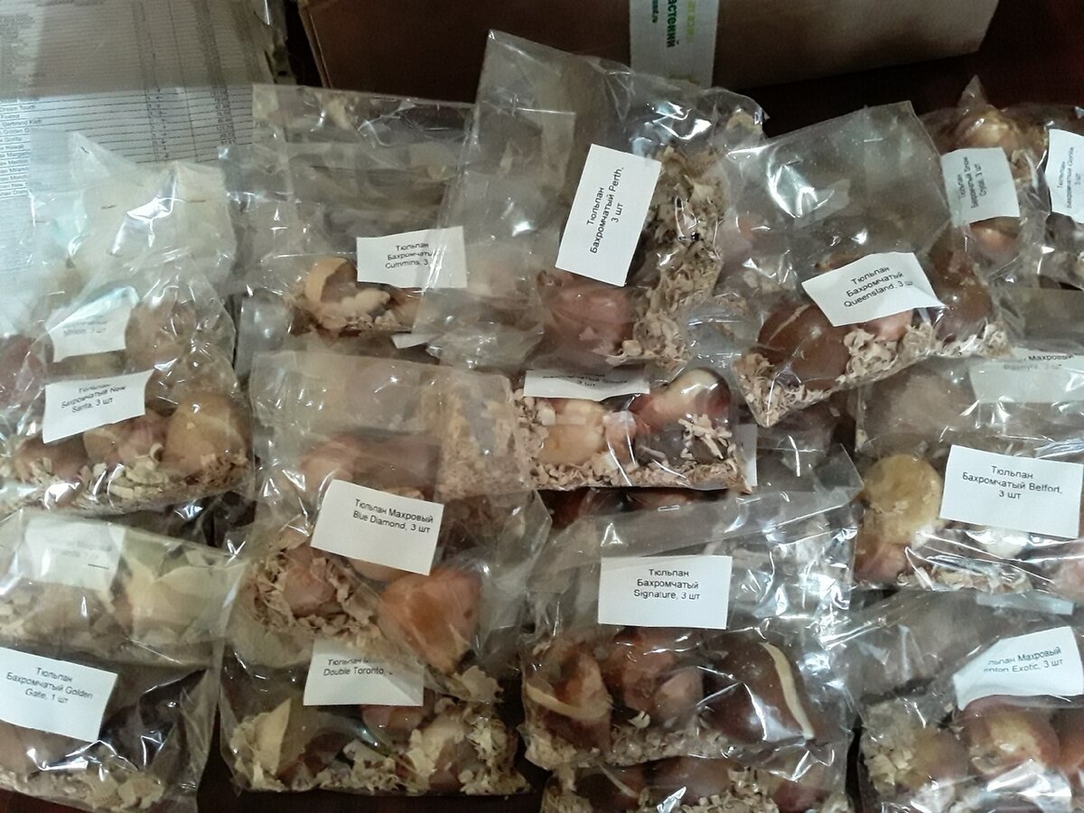 - Сохраненные луковицы рябчиков, гиацинтов и тюльпанов были распределены по пластиковым ящикам.