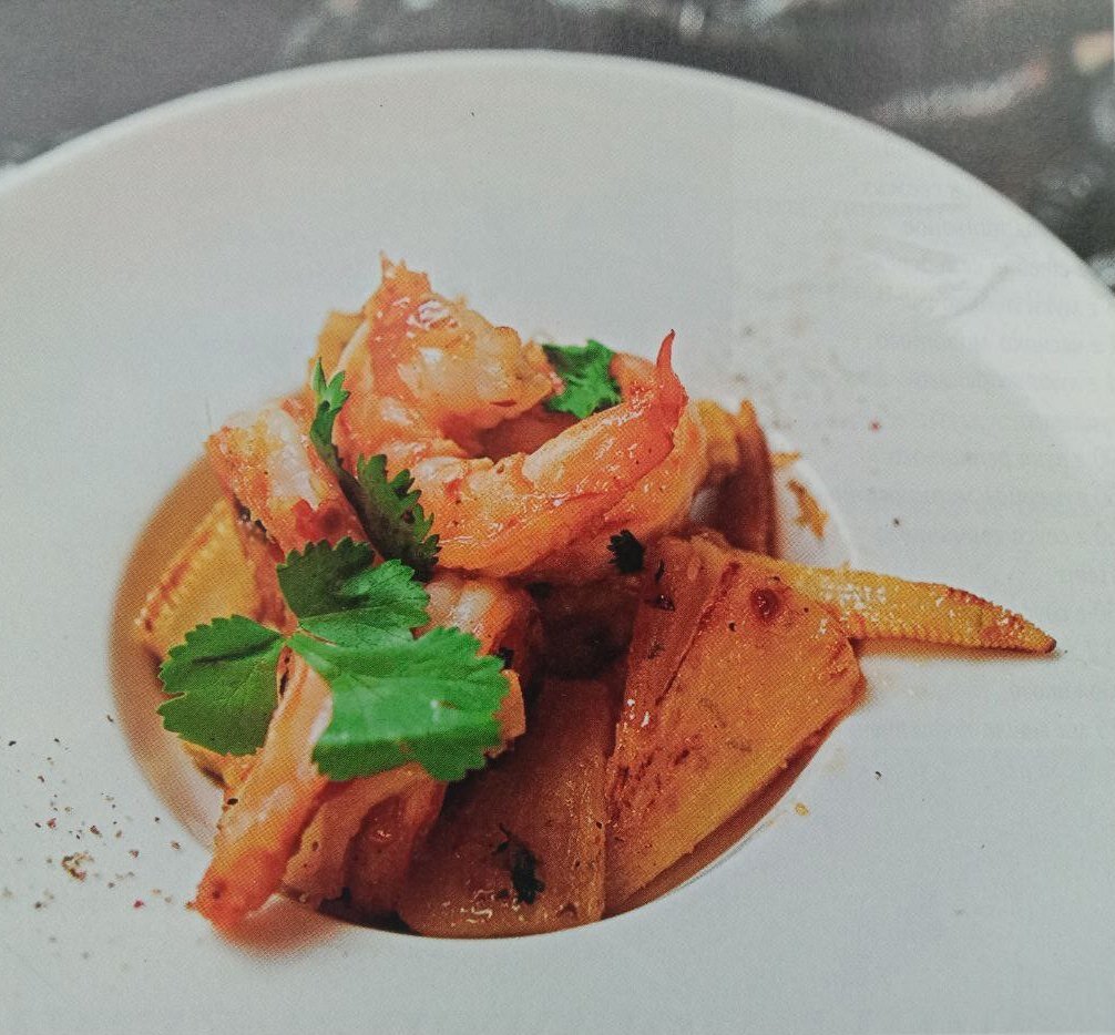 На разогретой сковороде капните немного масла и добавьте чили, имбирь, чеснок и листья лайма. Перемешивайте до тех пор, пока не поднимется ароматное облако. Затем пришло время добавить креветки, немного сливочного масла и приправы. Обжарьте их на сильном огне в течение полутора минут, после чего добавьте ананасы и жарьте еще полторы минуты. Затем влейте вино и быстро перемешайте, позволяя алкоголю выпариться.
