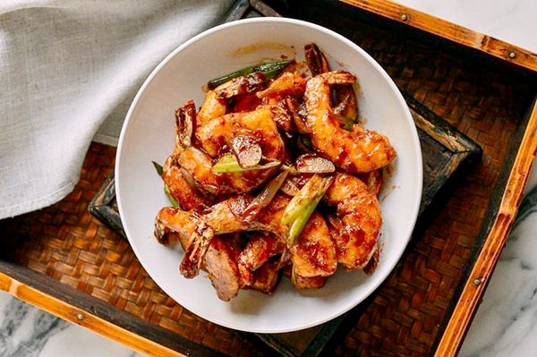 4. Финальные штрихи: Верните креветки в сковороду, влейте соевый соус и шаосинское вино, посыпьте сахаром и черным перцем. Обжаривайте еще 10 секунд.