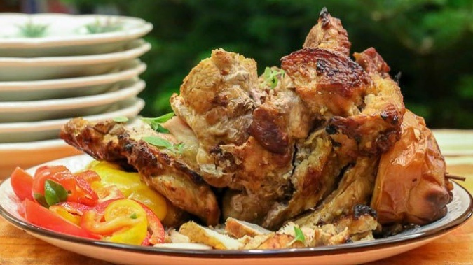 Затем установить конструкцию на противень и запекать около 1,5 часов при температуре 180 °C. Прежде чем извлечь кебаб, стоит проверить его готовность, надрезав кусочек из середины. Если он готов, смело можно подавать к столу.