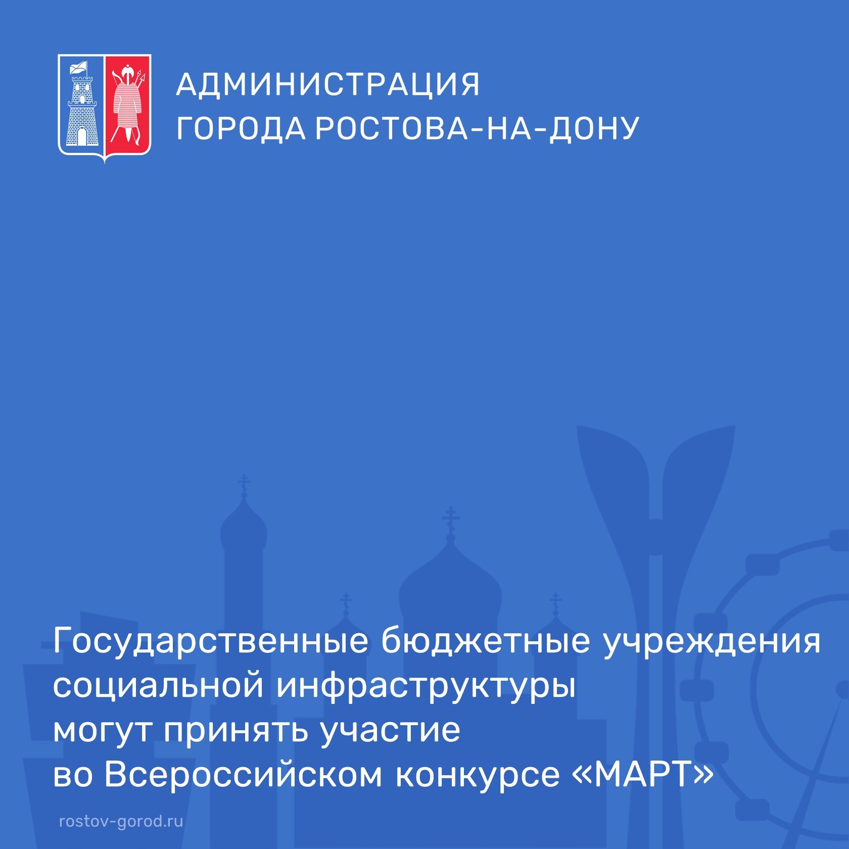 Государственные бюджетные учреждения социальной инфраструктуры Ростовской области в сферах образования, культуры, спорта, социальной защиты населения и санаторно-курортного лечения могут принять участие во внеконкурсном этапе Всероссийского конкурса объектов социальной инфраструктуры «МАРТ».