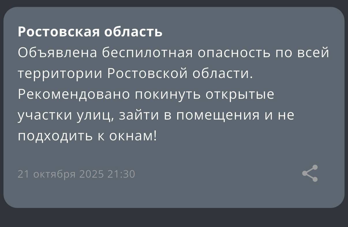Вчера, 21:36Объявлена беспилотная опасность по всей территории Ростовской области Рекомендовано покинуть открытые участки улиц, зайти в помещения и не подходить к окнам!// Блокнот-Ростов