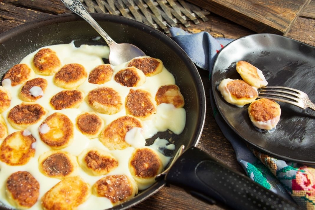 Перед подачей на стол в сковороду с приготовленными сырниками аккуратно вливается горячий заварной крем, чтобы он равномерно растекался между ними.