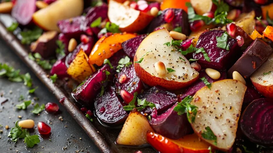 Груша нарезается тонкими дольками. На горячую запеченную свеклу выкладываются капуста, перец и свежие груши. Завершают оформление блюда кусочками козьего сыра, который, нагреваясь от овощей, мягко растает, придавая салату насыщенный вкус. Не забудьте полить все гранатовой заправкой перед подачей, украсив зернами граната и кедровыми орешками. Этот яркий, теплый салат станет не только отличным гарниром, но и полноценным блюдом для ужина.
