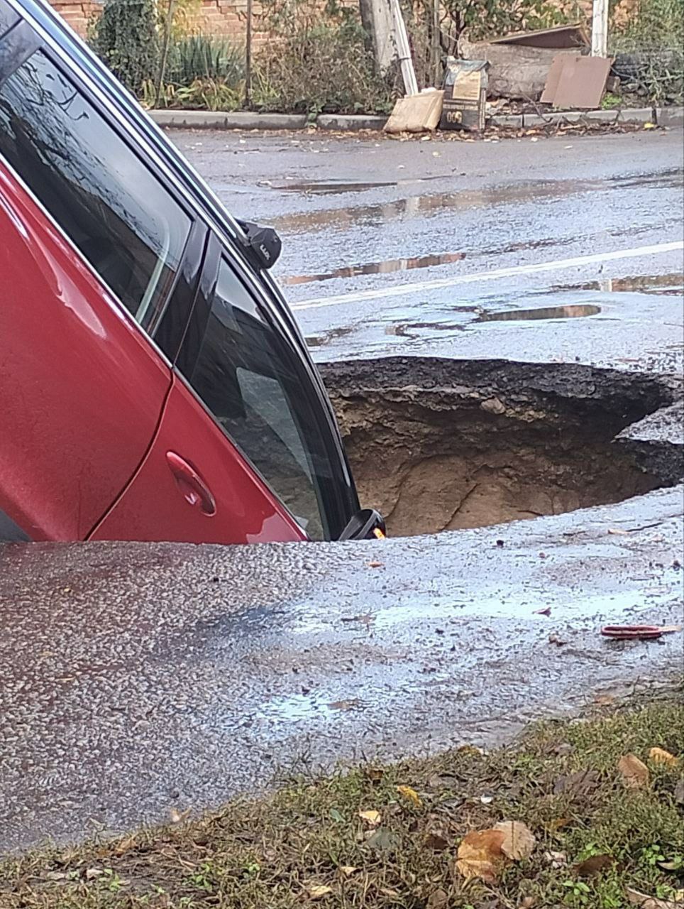 Провал в асфальте появился из-за протекающего люка уже давно. Сегодня после дождя туда окунулось детище китайского автопрома.