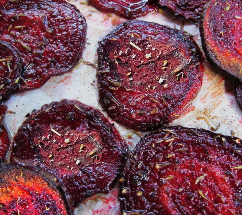 - Приготовление: нарежьте свеклу тонкими ломтиками, смажьте маслом и посыпьте специями. Запекайте в духовке до хруста.