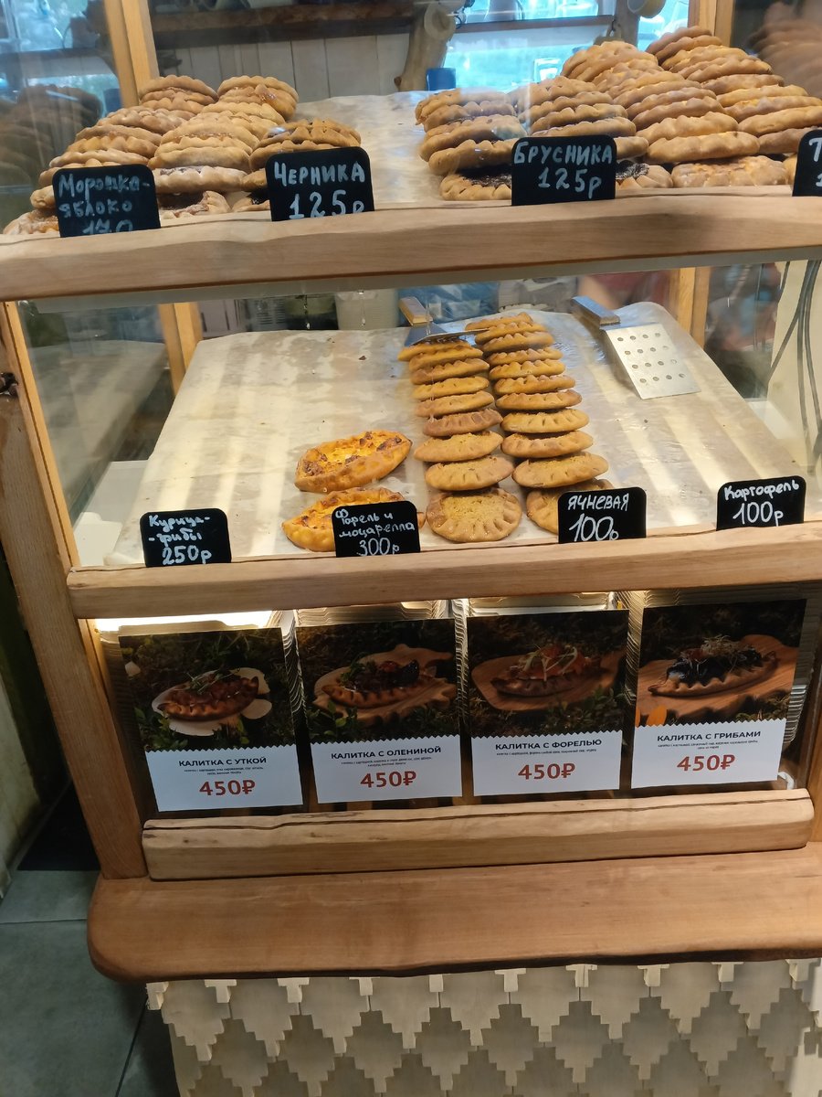 - Ассортимент пищи: в центре внимания — калитки, характерные карельские пирожки с разнообразными начинками, такими как оленина, морошка и сёмга. Помимо них, заведение предлагает также любимые блюда из картофеля и творога.