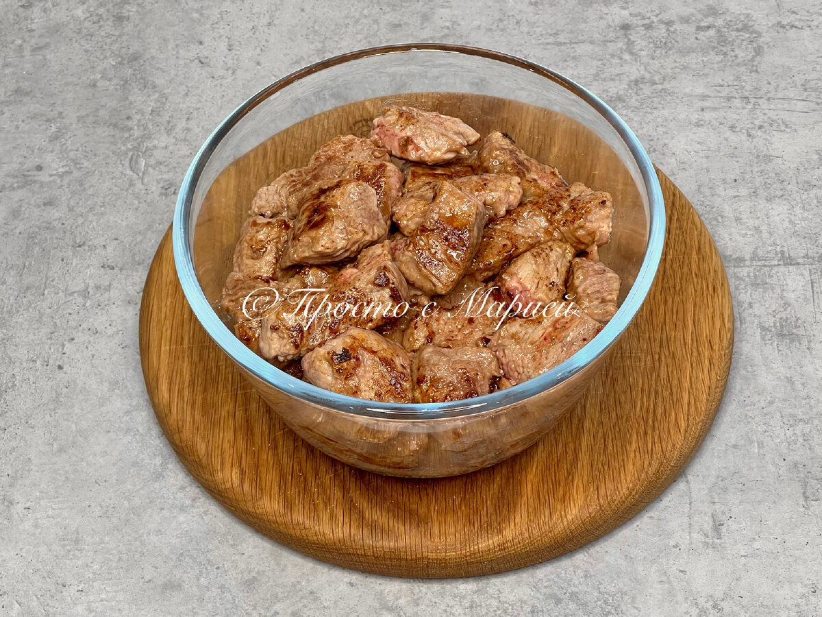 - Обжарка: Обжаривать мясо на разогретом растительном масле до золотистого цвета. При этом важно использовать сильный огонь, чтобы добиться красивой корочки, а затем выложить мясо в отдельную посуду.