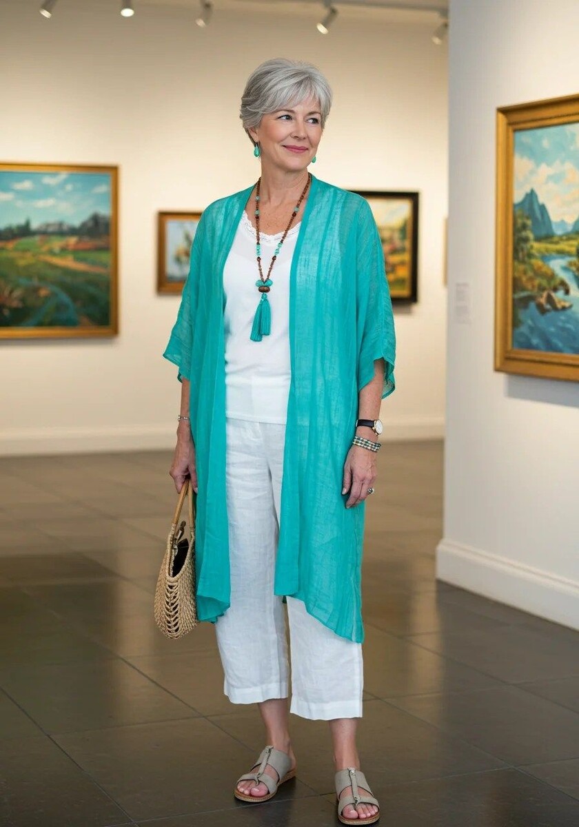 - Легкий белый комплект: Укороченные широкие брюки и футболка из натуральных тканей отличаются воздухопроницаемостью. Сочетание с бирюзовым кардиганом и обувью на низком ходу позволит создать непринужденный, но стильный образ. Не забудьте о плетеной сумке и модных аксессуарах!