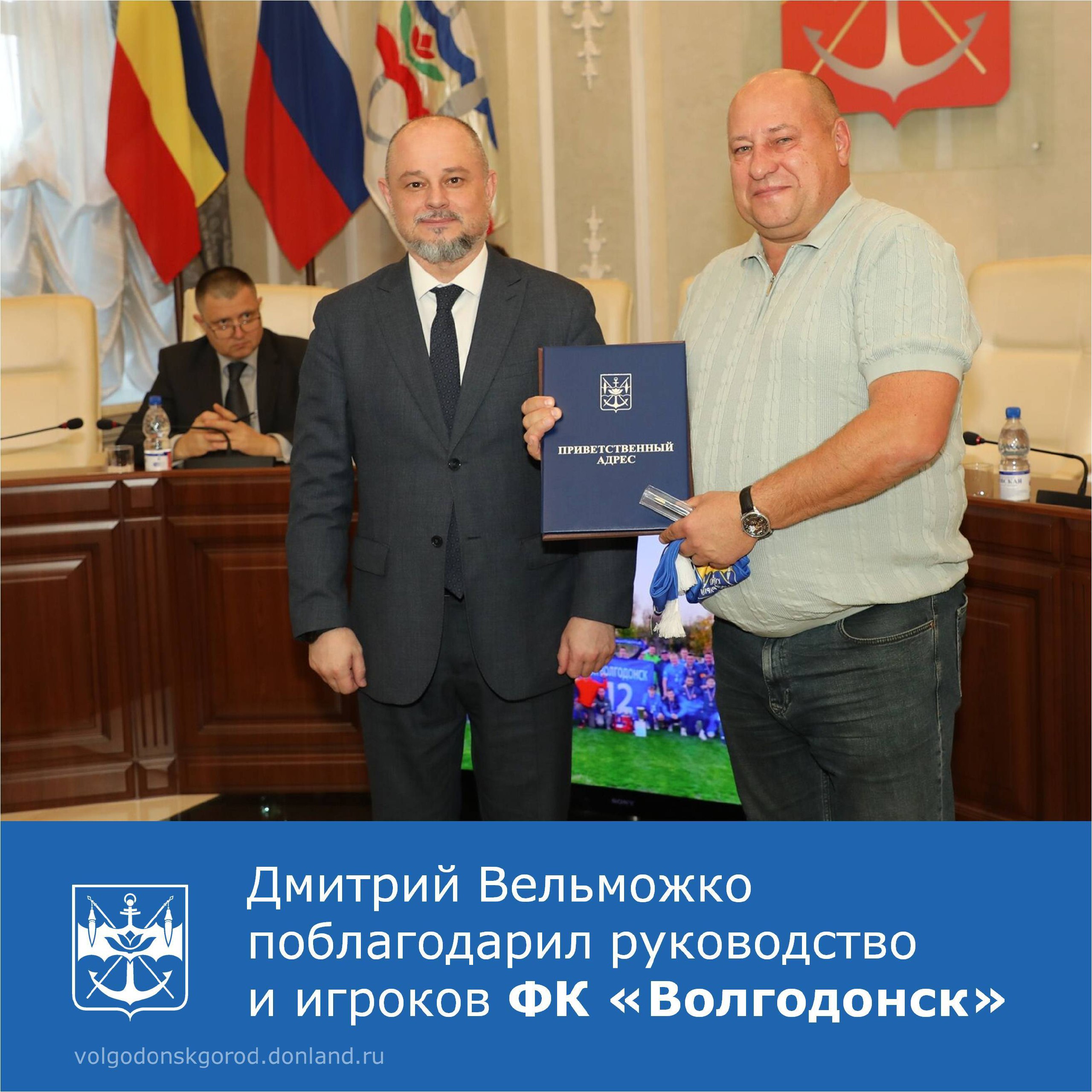 Глава Волгодонска Дмитрий Вельможко выразил благодарность игрокам и руководству футбольного клуба «Волгодонск» за успешное завершение футбольного сезона 2025 года. Особые слова признательности им были адресованы Президенту Фонда развития спорта «Футбольный клуб «Волгодонск» Сергею Морозову.