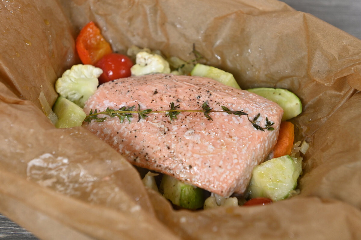 На этот овощной подушке поместите филе лосося, предварительно посолив и поперчив его. Не забудьте положить веточку тимьяна сверху и полить оливковым маслом для усиления вкуса. Оберните получившуюся конструкцию в пергамент, чтобы запеканка была надежно закрыта, и отправьте в заранее разогретую до 180 градусов духовку на 20 минут. Это время даст возможность всем ингредиентам объединиться и развить свой вкус.