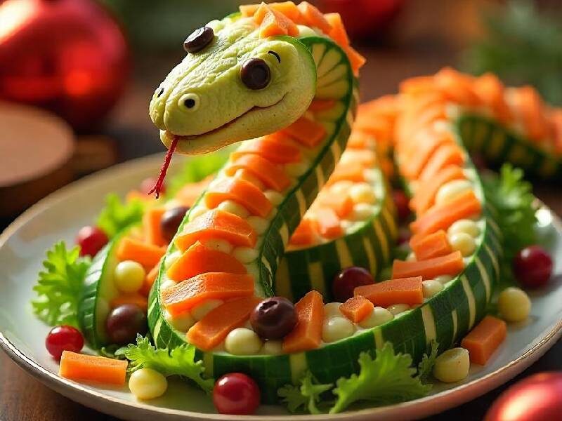 Такой кулинарный шедевр не только украсит новогодний стол, но и создаст праздничное настроение для всех гостей, подчеркивая уникальность и креативность хозяев. Салат в виде змеи обязательно станет ярким акцентом в этом грядущем году!