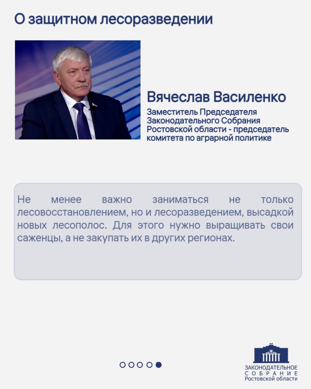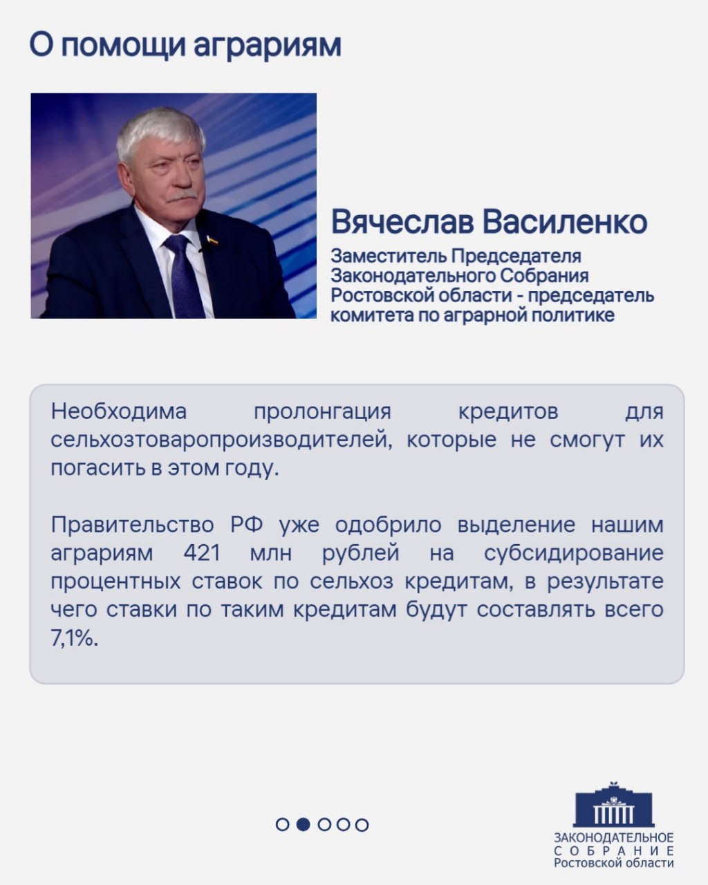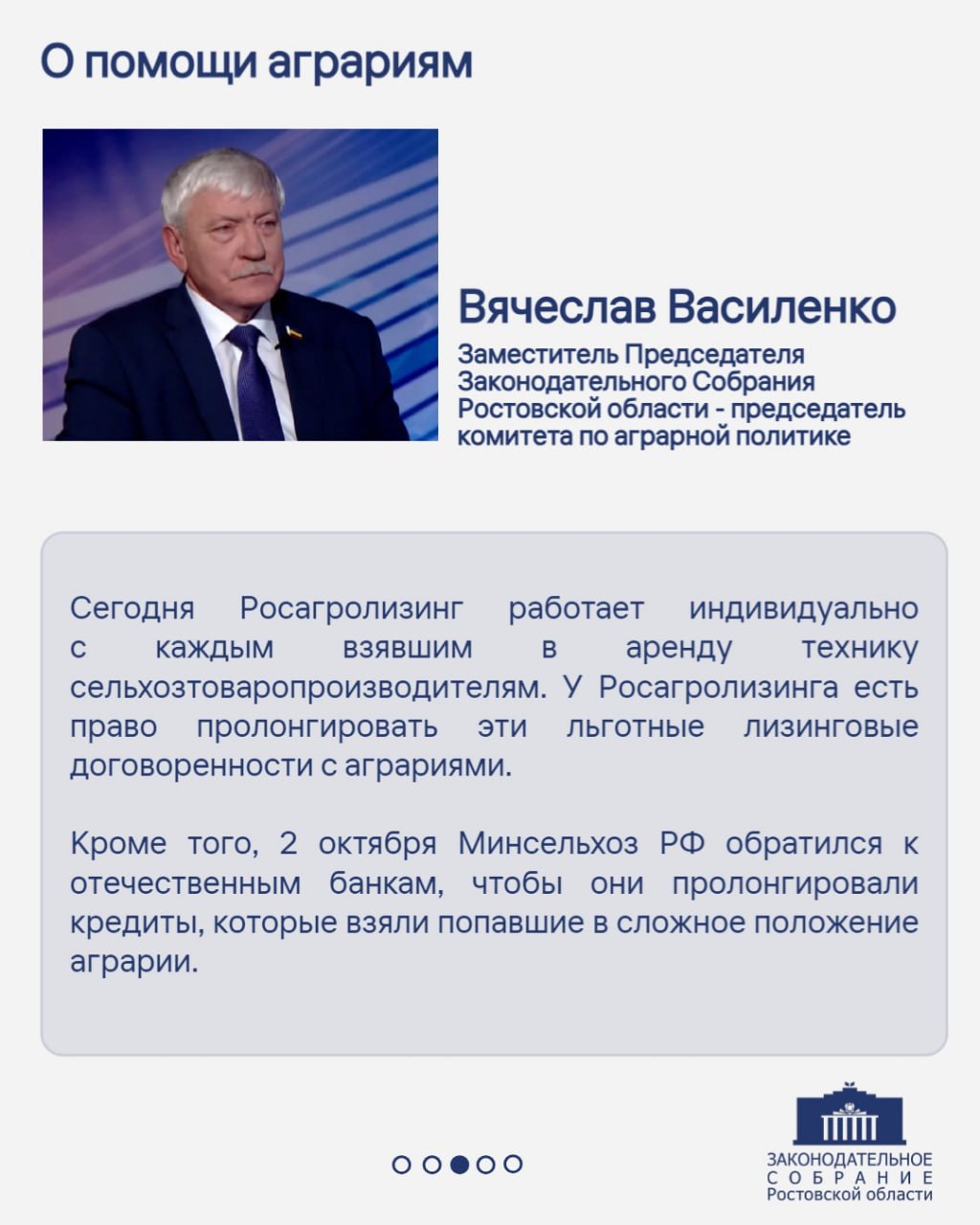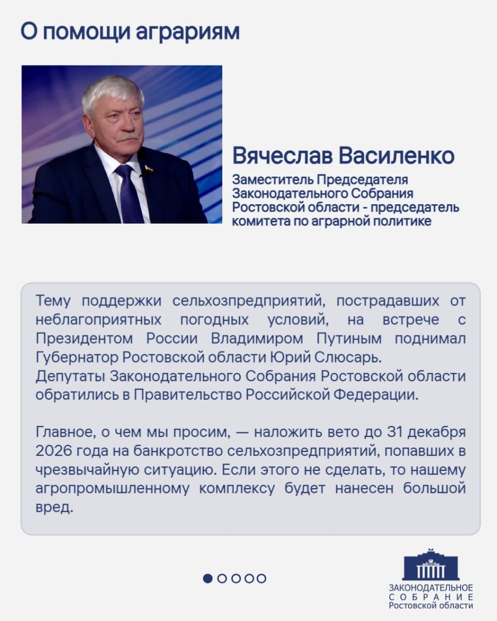 Заместитель Председателя Законодательного Собрания Ростовской области – председатель комитета по аграрной политике Вячеслав Василенко дал интервью телеканалу «Россия-24. Дон-ТР».