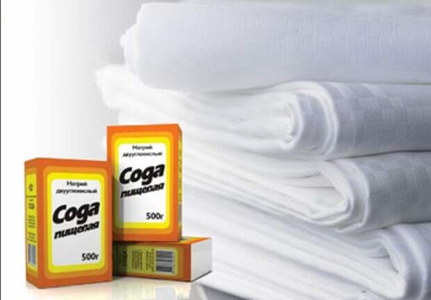 Пищевая сода отлично справляется с разными специфическими запахами. Например, для одежды, пропахшей дымом, стоит замочить её в содовом растворе, а для потных вещей – оставить на ночь в аналогичном растворе. Для устранения нефтяных пятен можно поместить вещи в герметичную упаковку с содой и моющим средством на день-два. Даже в критических ситуациях, когда под рукой нет средств для стирки, можно использовать только соду.