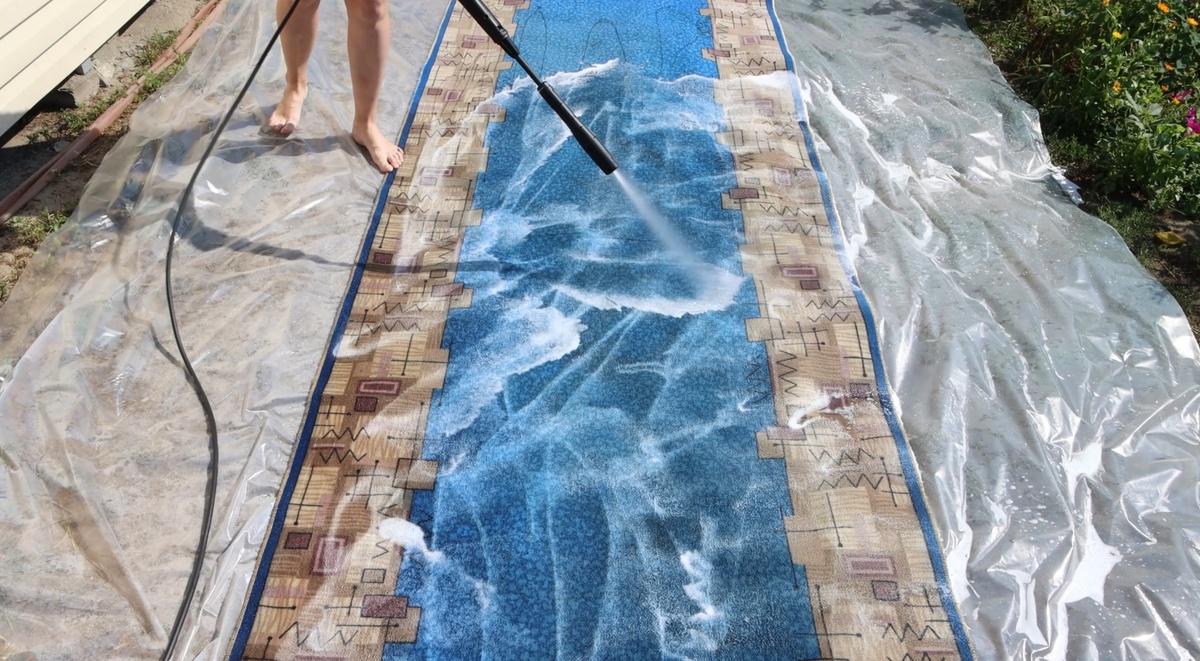 - Мойка высокого давления: идеальный вариант для дачных условий, если ковров много. Пленный способ позволяет быстро обновить ковры за день. Однако важно следить за напором воды, чтобы не повредить ворс.