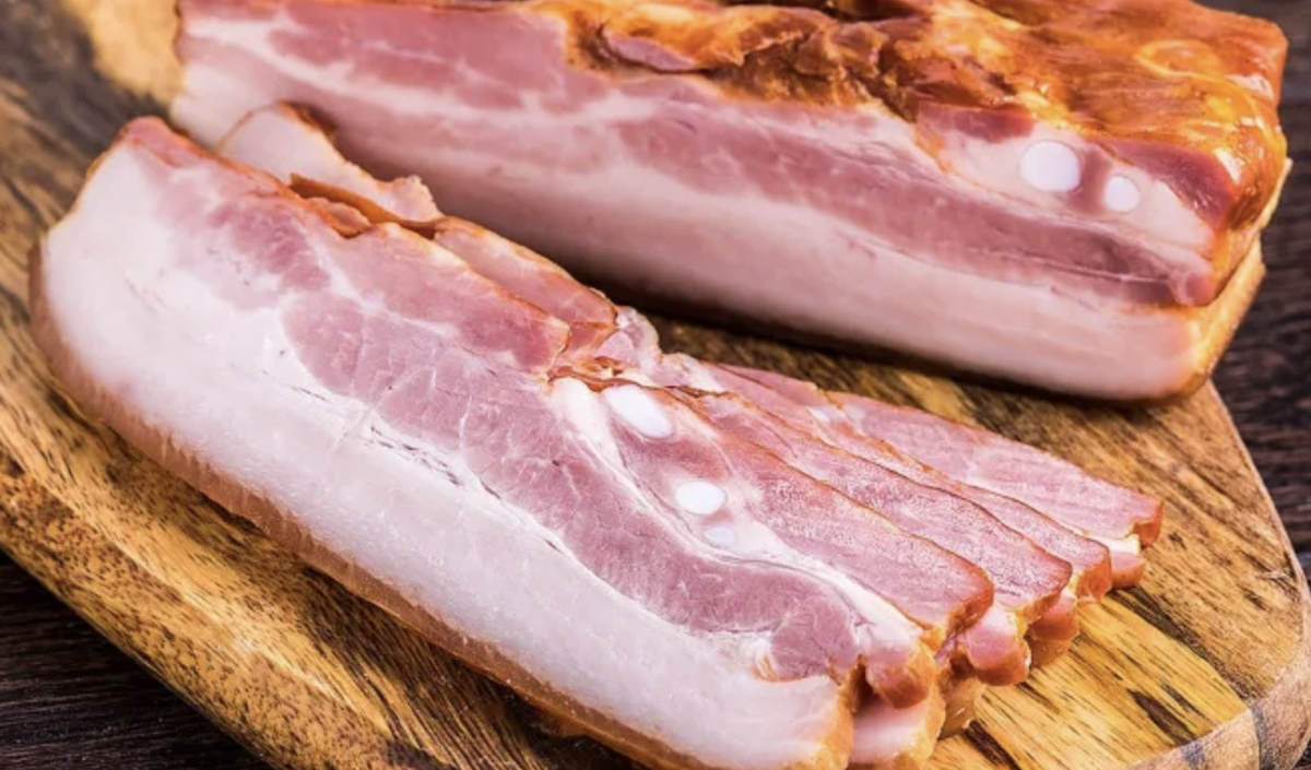 - Свиная грудинка: Копченая деликатесная грудинка может соблазнять своим ароматом и внешним видом, но в ее составе часто присутствуют нитраты и химические добавки. Вместо того чтобы тратиться на такую «вкуснятину», лучше приготовить мясо самостоятельно, что будет и дешевле, и полезнее для здоровья.
