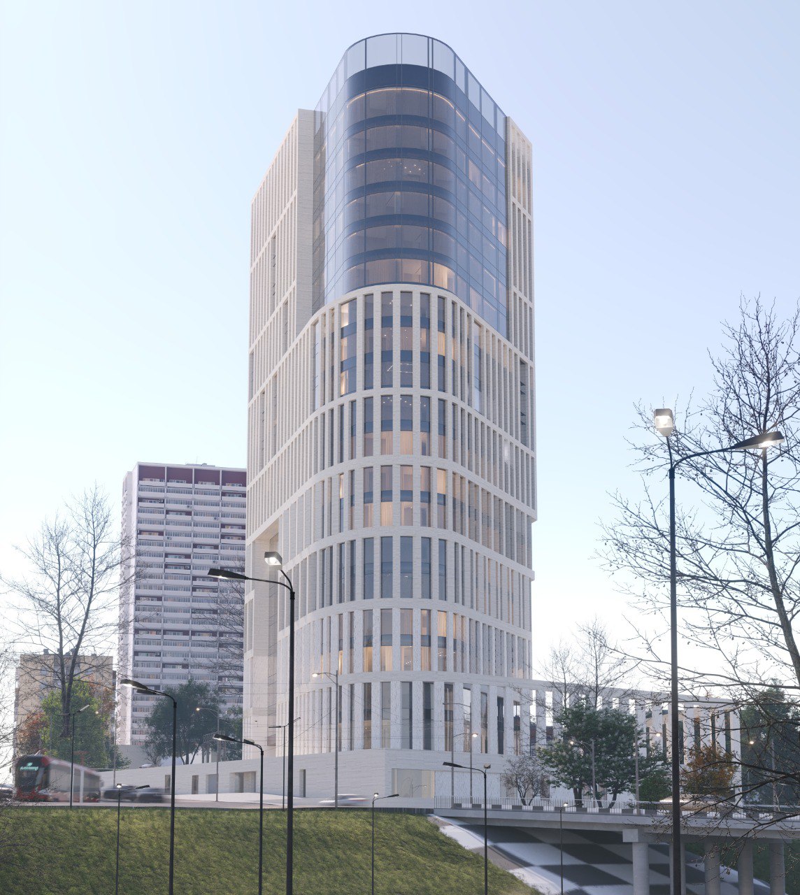 Согласно новому проекту, на трёх подземных уровнях появится паркинг. На первых трёх этажах расположатся вестибюли пятизвёздочного отеля и фитнес-центра, бар, ресторан, спа-зона, несколько конференц-залов и кафе. На остальных этажах будут офисные помещения и номера.