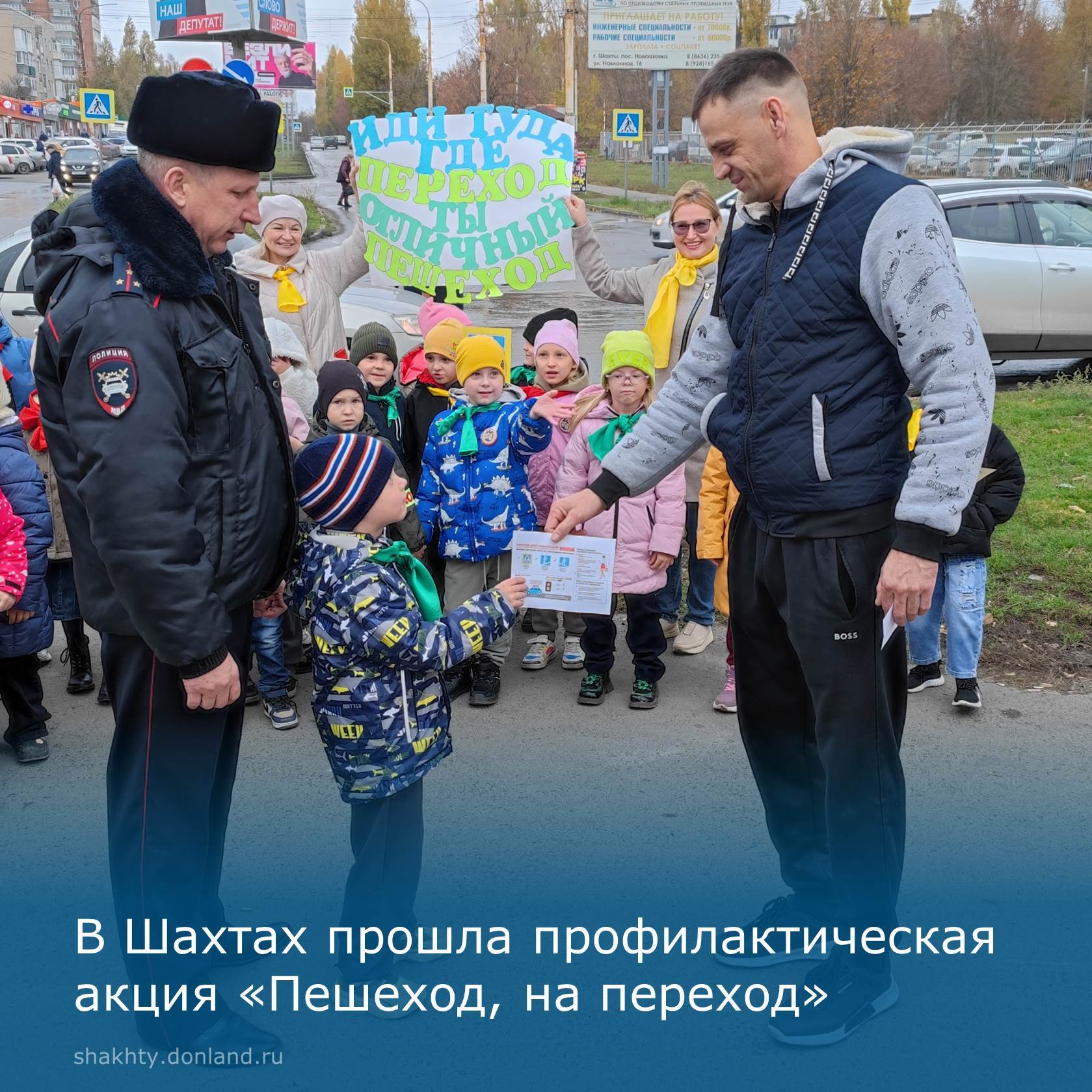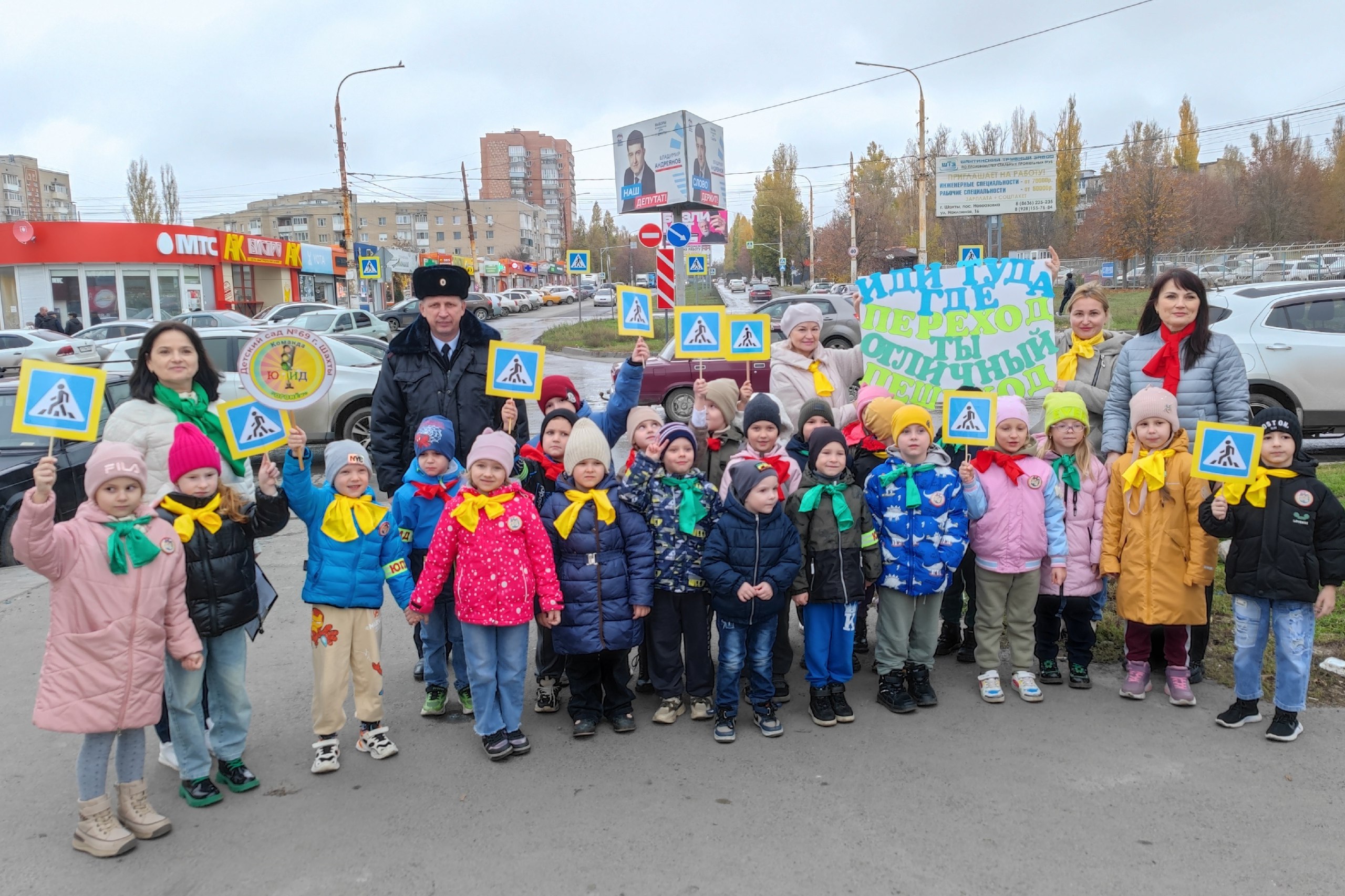 В рамках областной акции «Осень. Дети. Безопасность» командир отдельного взвода ДПС Госавтоинспекции УМВД по г. Шахты Алексей Смирнов вместе с командой Юных помощников инспекторов движения детского сада № 22 и «Родительским патрулем» провели профилактическую акцию «Пешеход, на переход».