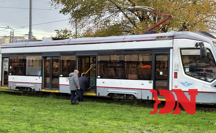 Трамвай, в котором пырнули ножом пассажира, отогнали с места происшествия, сейчас его осматривают полицейские.