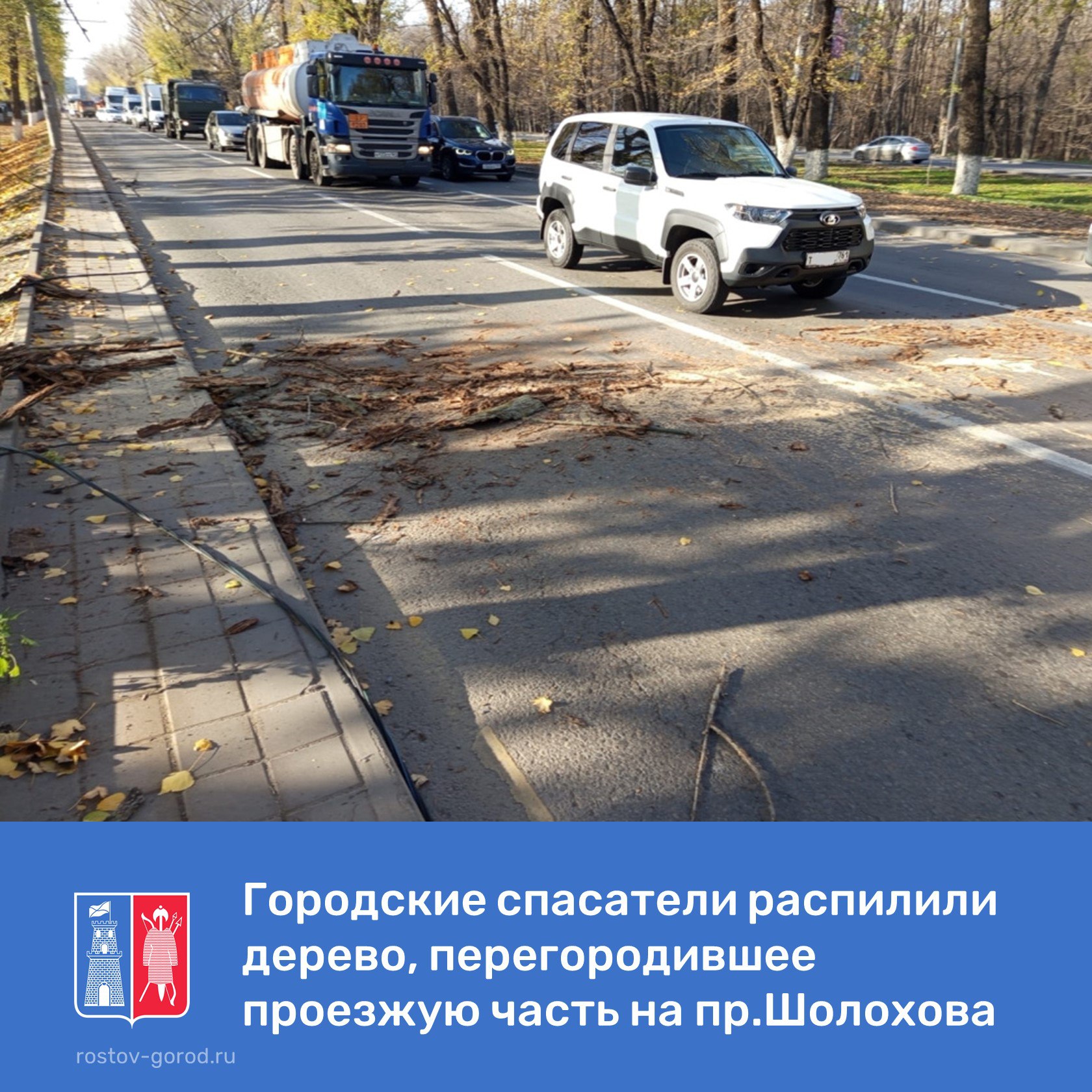 Сегодня в 9:40 в Единую дежурную диспетчерскую службу Управления по делам ГО и ЧС города поступило сообщение об упавшем на проезжую часть дереве на проспекте Шолохова, 282 б.
