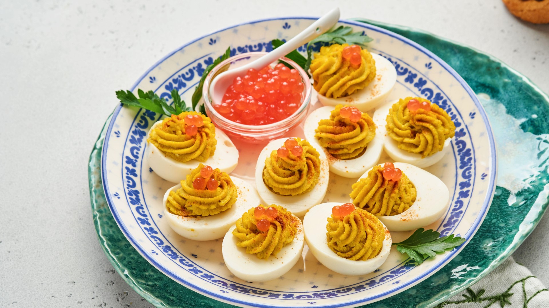 К каждому Новому году хозяйкам приходится проявлять всю свою фантазию, чтобы приготовить небанальные, но всеми любимые блюда к праздничному столу. Обойтись без традиционных фаршированных яиц никак не получится, но простор для выбора начинок огромен. Чтобы долго не мучиться, предлагаем попробовать этот проверенный рецепт.