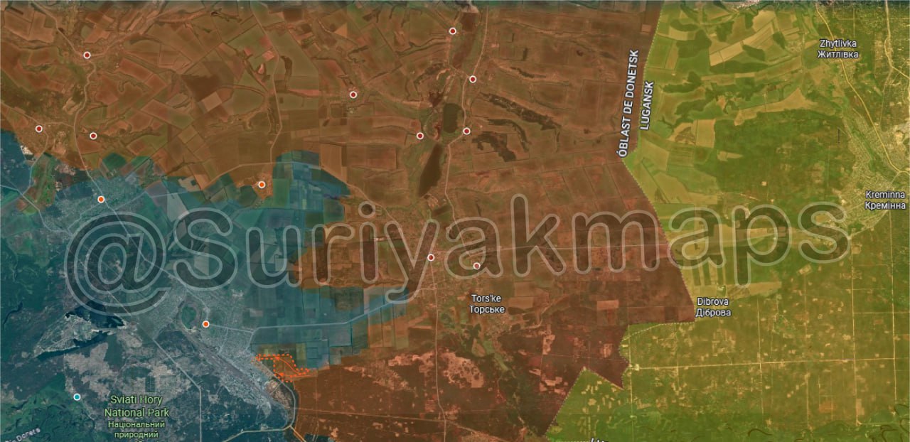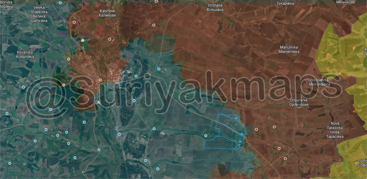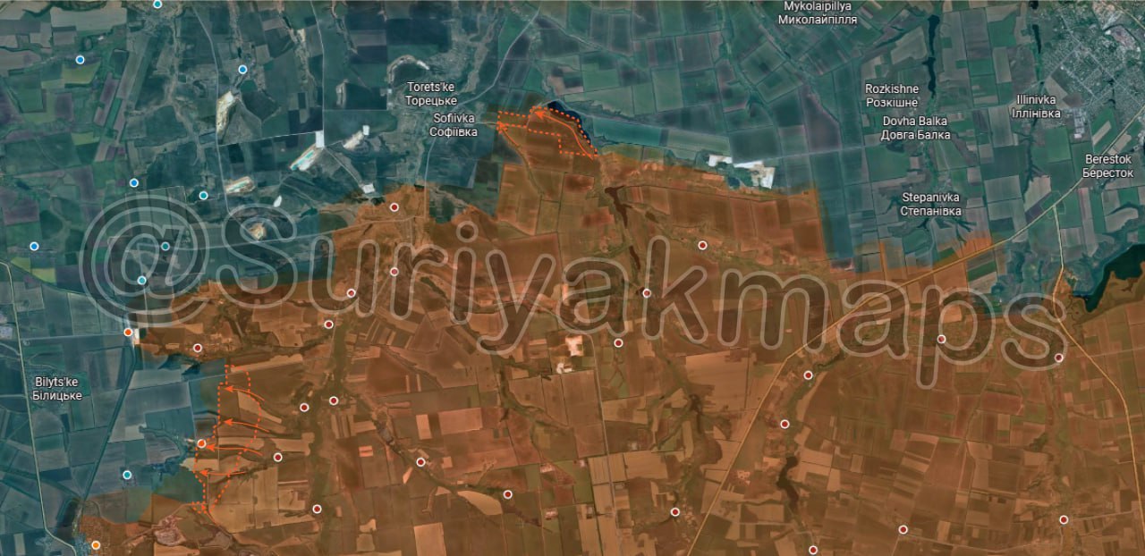 Восстановлен контроль над ранее утраченными рубежами между населёнными пунктами Бойковка и Затишок. Проведено повторное вхождение в окраинные районы последнего. Отбиты ранее оставленные позиции южнее Винокурненского водохранилища. Продолжено продвижение в сторону Софиевки.