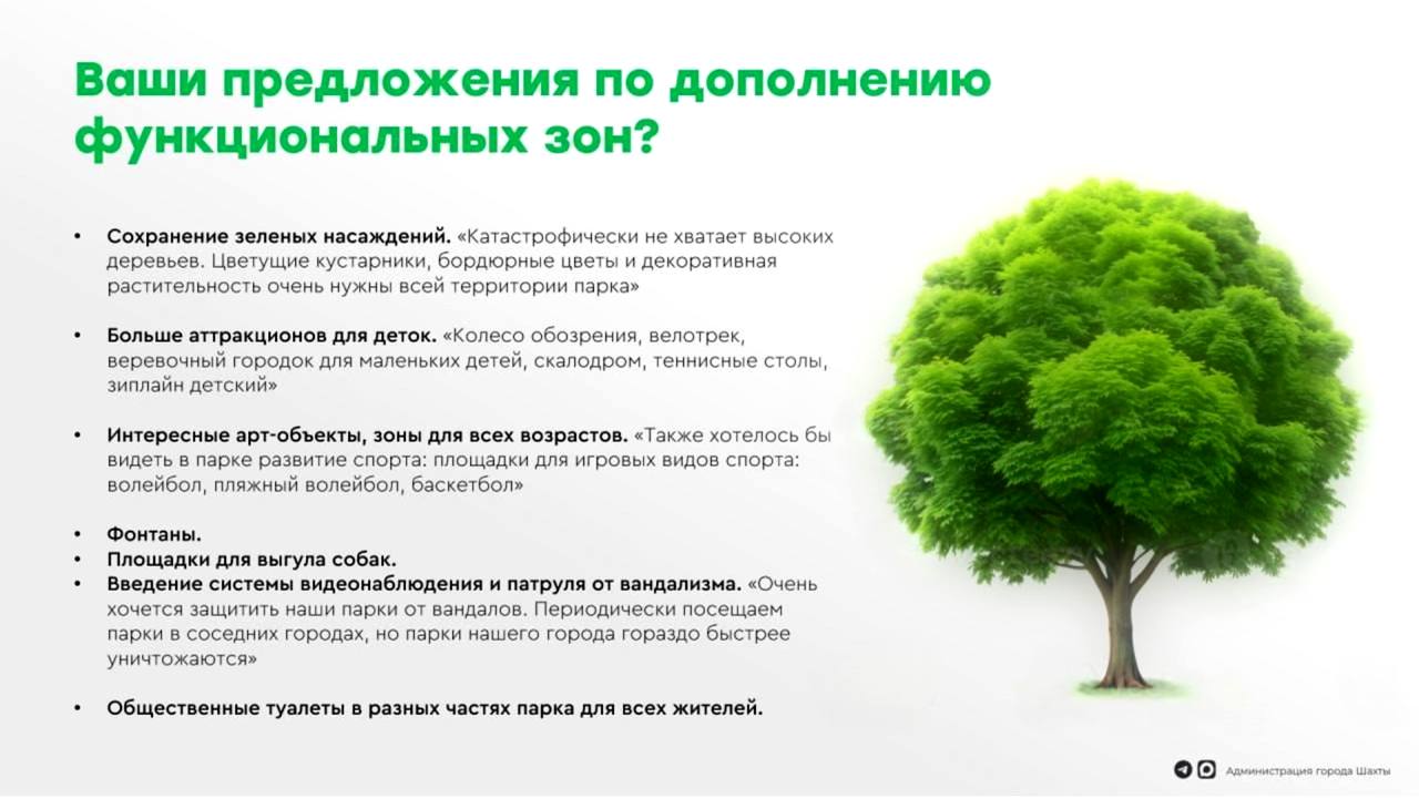 Среди предложенных вами идей: сохранение зеленых насаждений, круглосуточное патрулирование, водный объект, зоны для разновозрастной активности — от зип-лайнов и воркаутов до точек притяжения самого старшего поколения. А также жители хотели бы видеть в парке фонтаны, площадку выгула для собак, общественные туалеты и систему видеонаблюдения для недопущения вандализма.