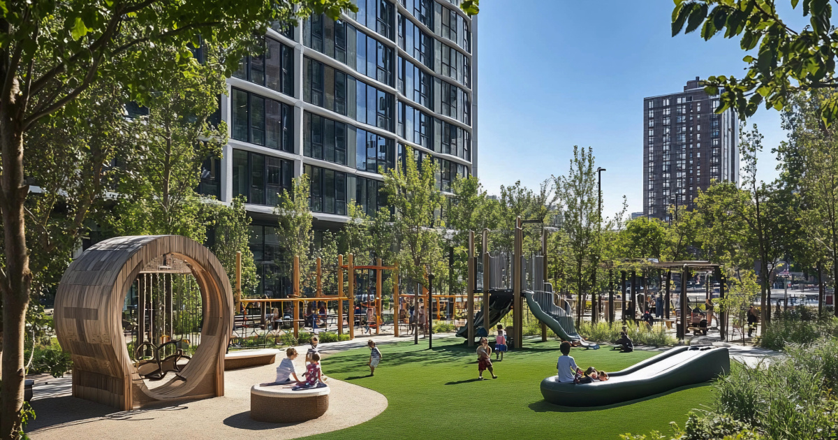 - Спортивные и детские площадки — горки, качели и тренажёры.