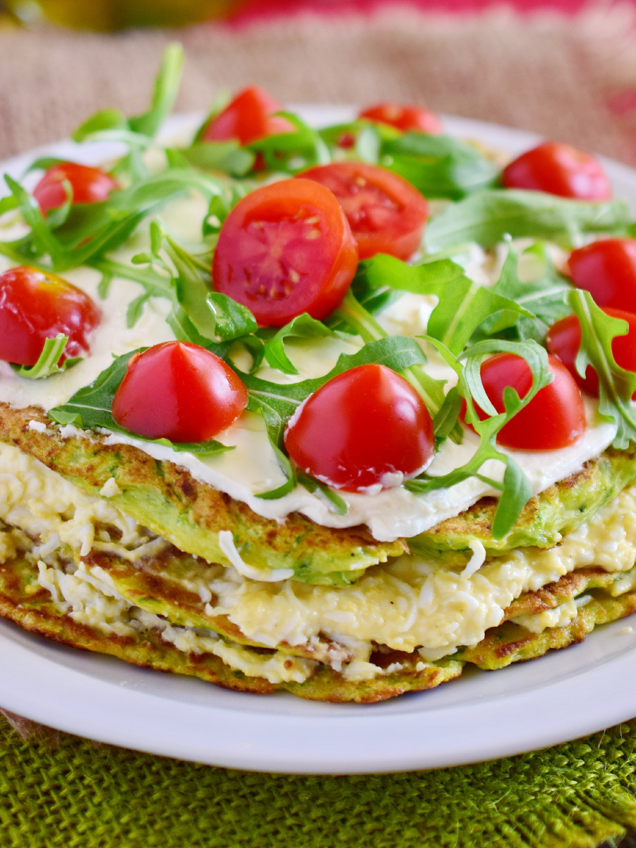 Приступаем к сборке торта: на первый блинчик выкладываем половину начинки, равномерно распределяя по поверхности. Накрываем вторым блинчиком, наносим оставшуюся начинку и закрываем третьим. Верхний блинчик следует смазать майонезом для более аппетитного вида. Украсить торт руколой и половинками помидоров черри. Рекомендуется оставить закуску в холодильнике на 10-15 минут перед подачей, чтобы она немного пропиталась. Нарезать на порционные кусочки и подавать с легкими салатами и напитками.