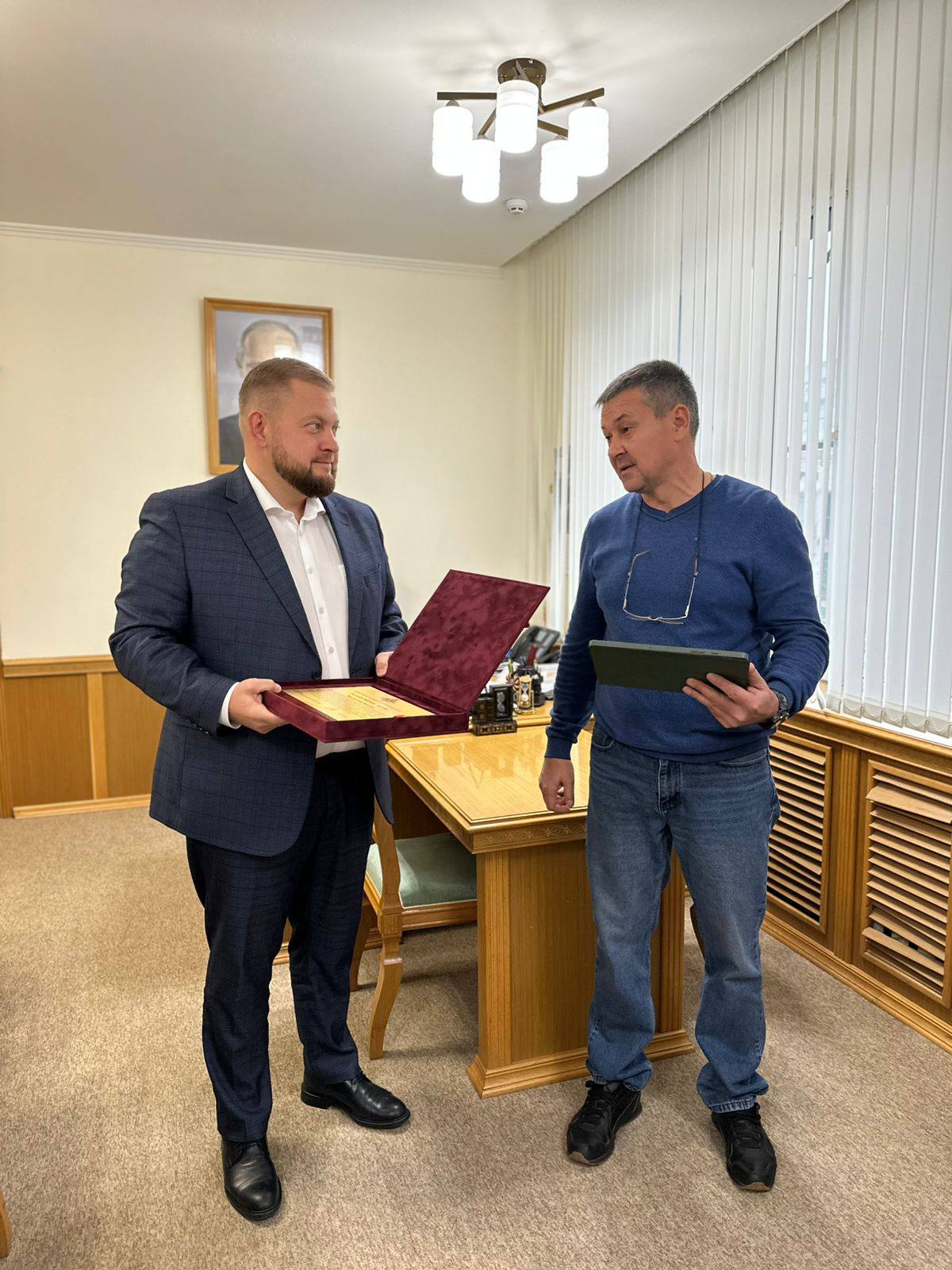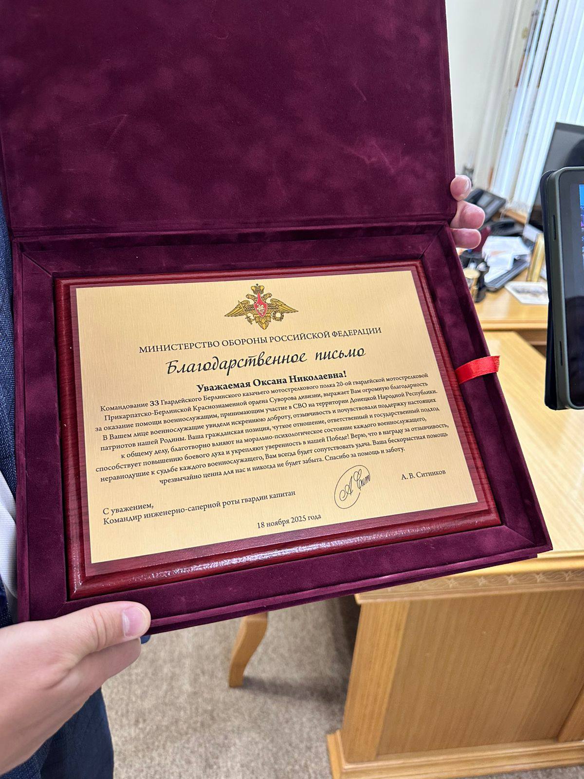 Вручил письмо благодарности, переданное из зоны СВО, директору спортшколы №2 Оксане Кожариной. Так бойцы Донецкого направления поблагодарили наши образовательные учреждения и управление образования за регулярную помощь и поддержку.