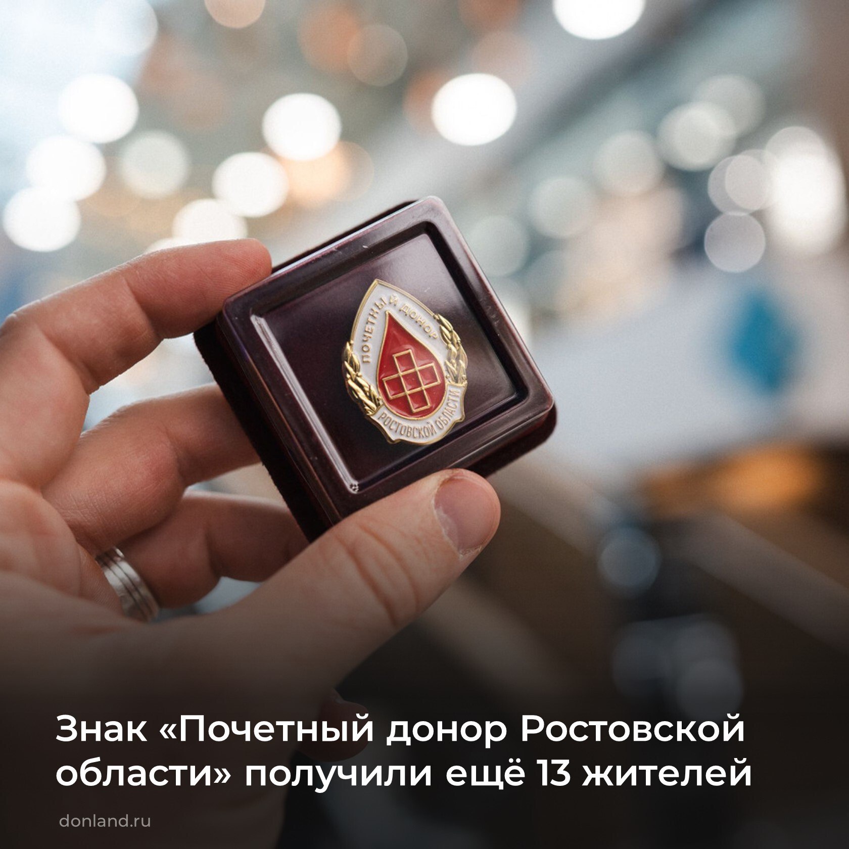 Звание «Почётный донор Ростовской области» учреждено по решению губернатора Ростовской области в декабре прошлого года. Почётное звание присваивается жителям региона, сдавшим кровь от 30 до 40 раз или плазму крови от 40 до 60 раз.