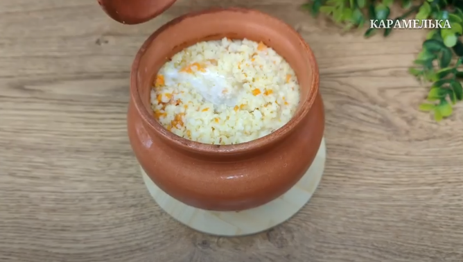 На дно глиняного горшка выкладывается часть сливочного масла, затем добавляется промытое пшено, нарезанная тыква, сахар и щепотка соли. Все это заливается молоком, чтобы полностью покрыть крупу.