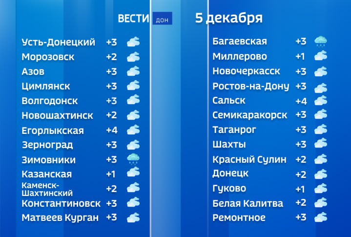 Но снег синоптики обещают лишь по северу региона. В остальной части возможен небольшой дождь.В Ростове +3 °С днём и +3 °С ночью.Подробнее расскажет наша виртуальная ведущая Аксинья Донцова.ДОН 24 | МАХ