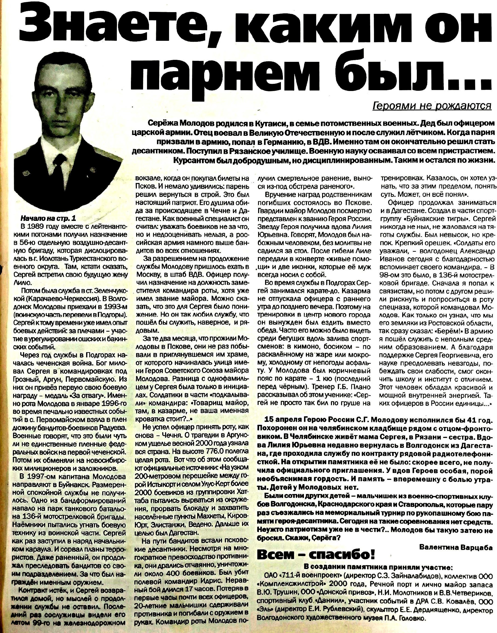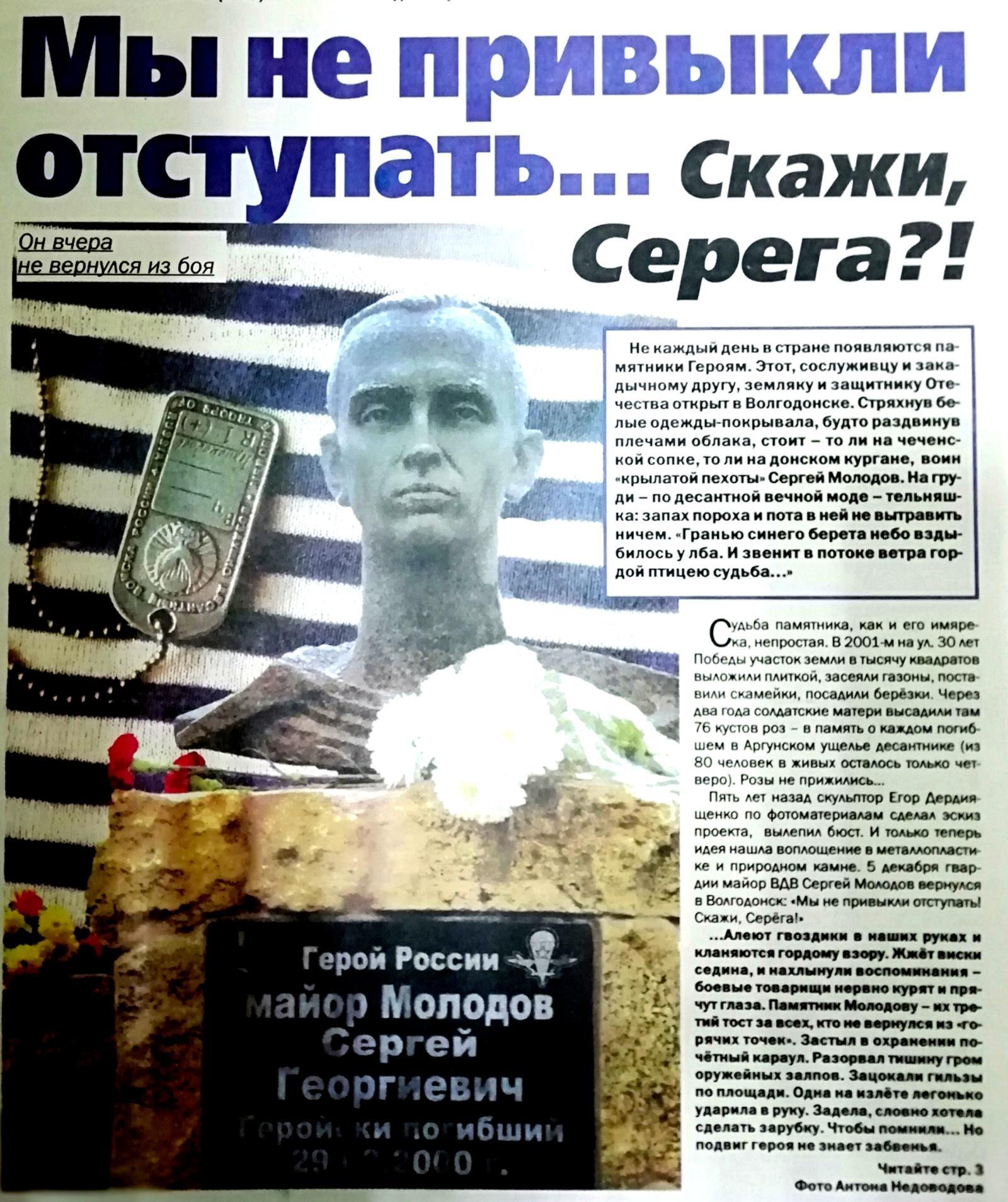 5 декабря 2006 года состоялось открытие памятника Герою России, нашему земляку Сергею Георгиевичу Молодову, в сквере, носящем его имя. Российский десантник, гвардии-майор погиб 28 февраля 2000 года в Аргунском ущелье во время боя у высоты 776 в период второй чеченской войны. В жестоком бою с чеченскими боевиками погибли 84 гвардейца-десантника. В той схватке – офицеры, сержанты и солдаты, все, как один, до последнего дыхания, удерживали занимаемую высоту и вышли победителями. Вынося из-под обстрела раненого, Сергей Георгиевич Молодов получил смертельное ранение. Указом Президента РФ в марте 2000 года ему присвоено звание «Герой Российской Федерации» (посмертно).