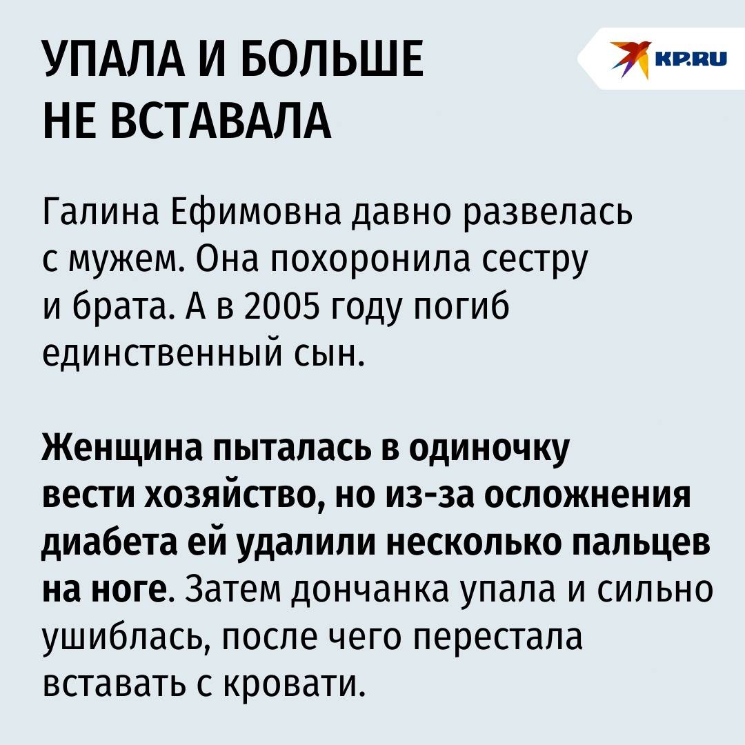 Недавно в одну из больниц Ростовской области доставили 78-летнюю женщину. Галина Ефимовна была истощена, весила всего 42 килограмма. Первое время дончанка лежала под капельницами, ей переливали кровь, вводили препараты.