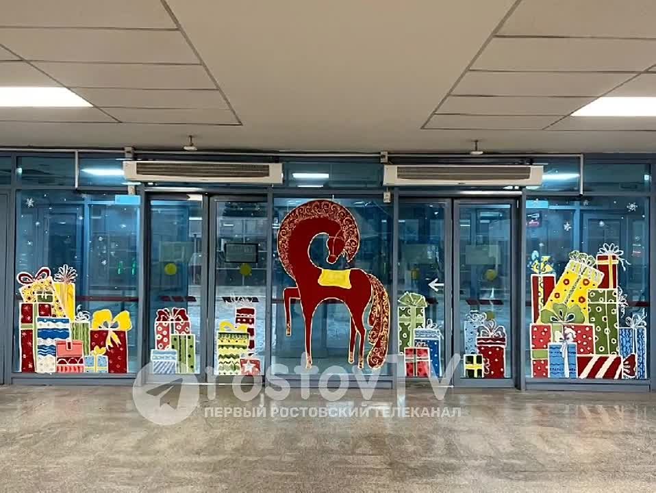 Уезжающих и прибывающих теперь встречает Огненная лошадь с подарками. Стеклянные двери вокзала украсили учащиеся детской школы искусств №8 им. Шостаковича. Над рисунком юные художники работали несколько дней: сначала делали эскиз, потом заполняли наброски и прорисовывали детали.