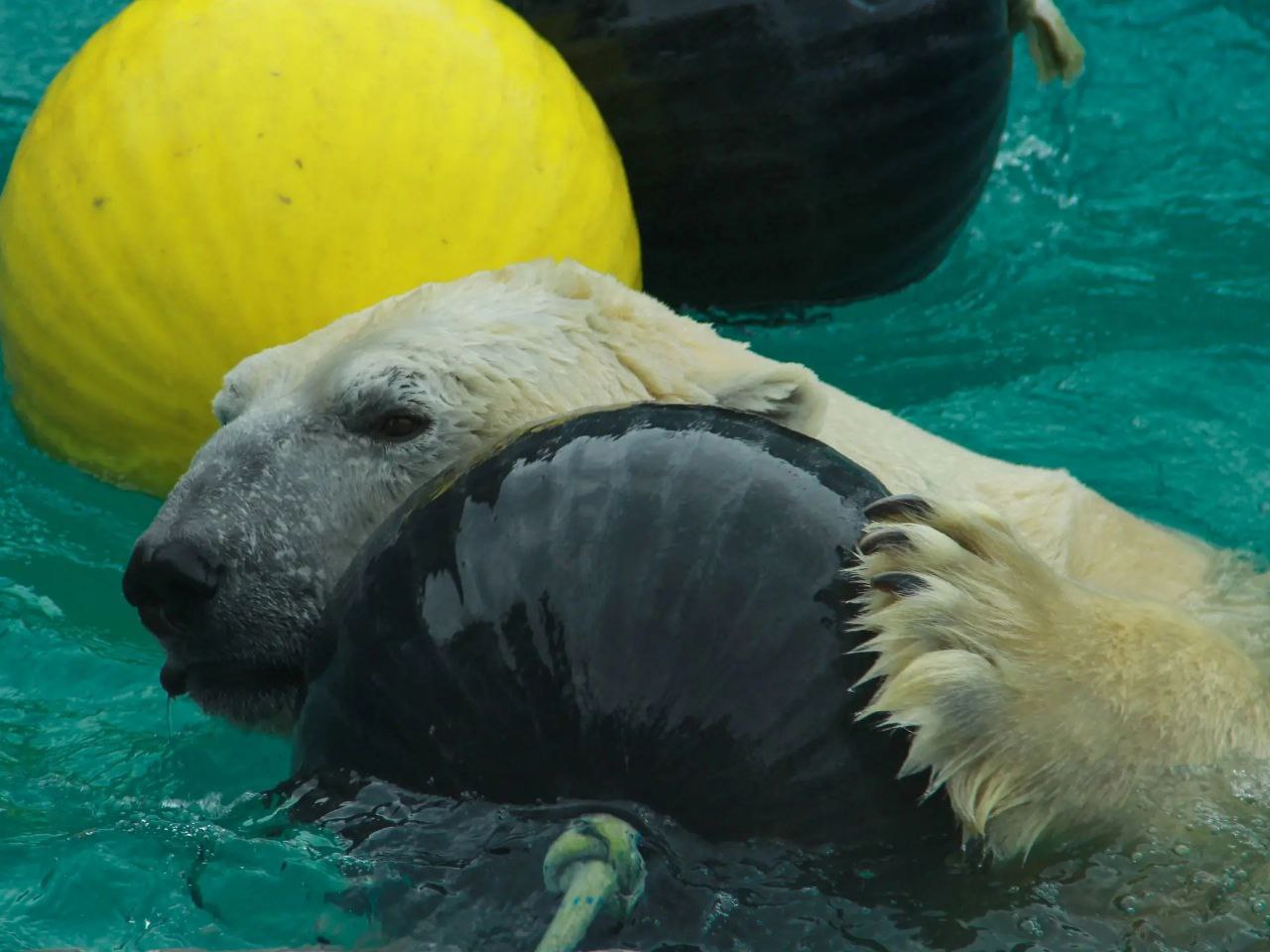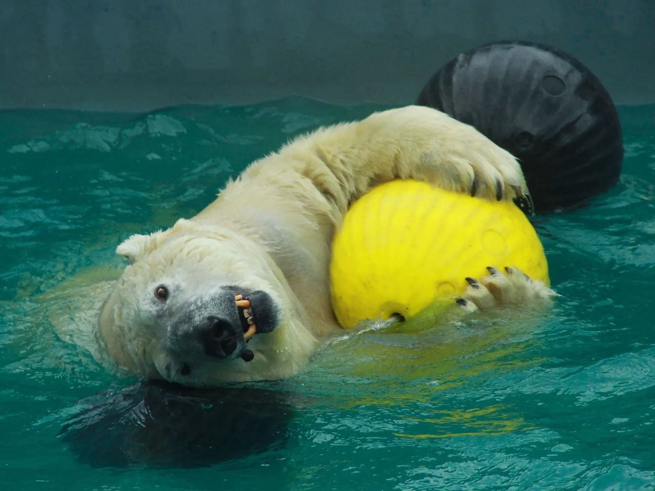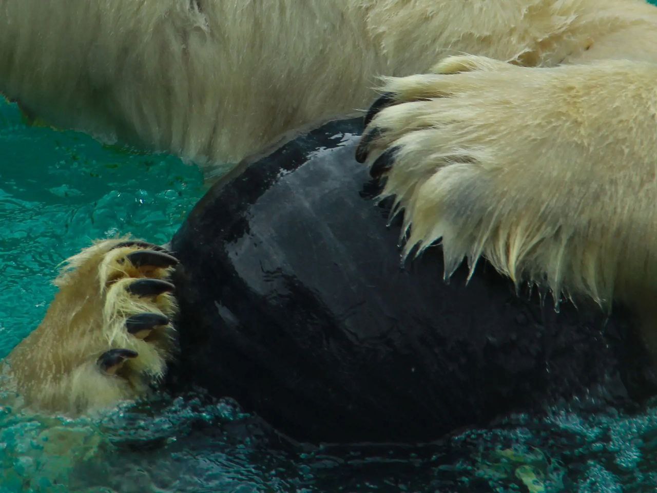 Вот белые в отличие от бурых в это время года бодры и свежи. Только посмотрите на Айона из нашего зоопарка. Пока его сородичи уютно мнут сено в берлогах, он с радостью плещется в бассейне и играет с шарами.