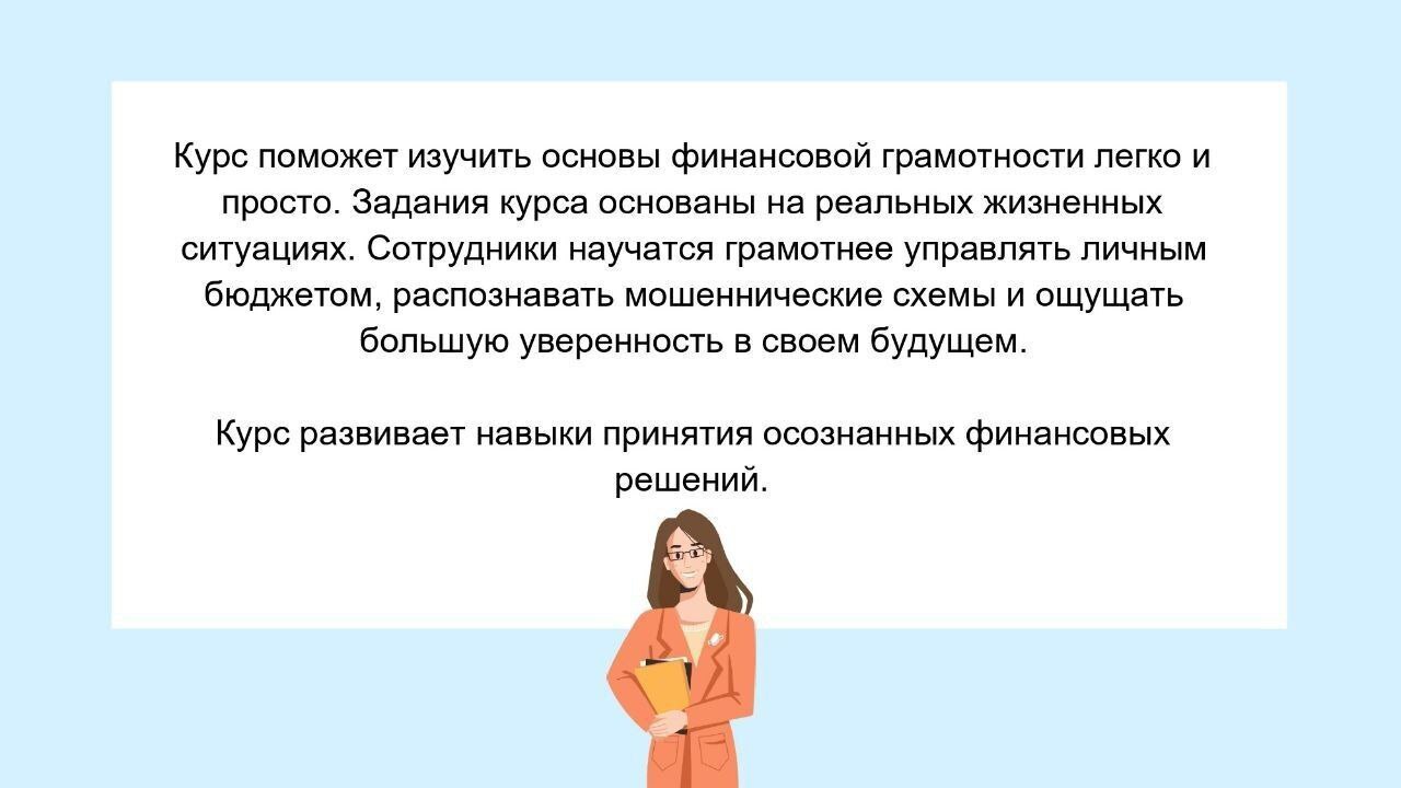 Материалы будут особенно полезны для тех, кто еще не знаком с основами финансовой грамотности и только начинает ее изучать. А более опытные участники проверят и закрепят уже имеющиеся знания.