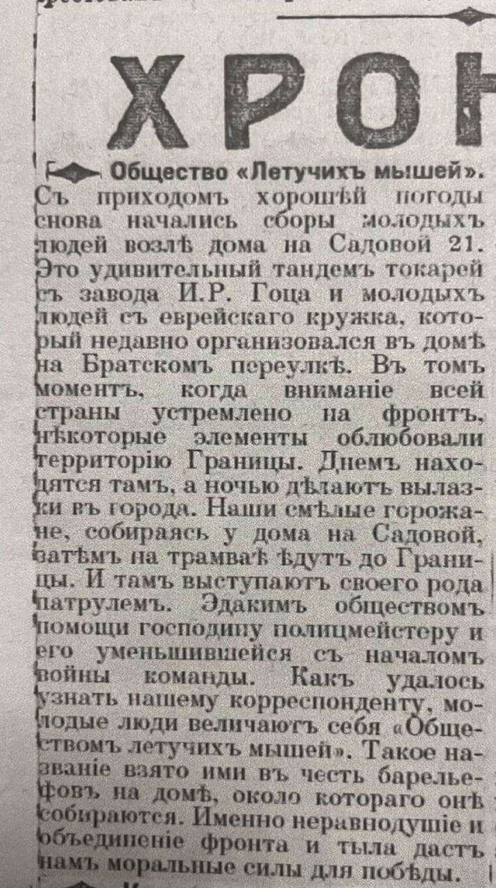 Если вы вдруг не знали: среди жителей ходила история о том, что в ХХ веке полиции в борьбе с преступностью помогало некое "Общество летучих мышей". Считалось, что местом сходки темных рыцарей был дом № 23 на Садовой с барельефами летучих мышей.