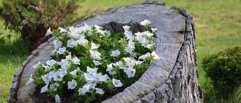 Пни, заполненные хорошим питательным грунтом, способны стать домом для лилий, особенно морозостойких азиатских гибридов. Нежные анютины глазки, яркие бархатцы и экзотические настурции также отлично впишутся в такие композиции. Пни органично смотрятся в окружении камней, а вокруг них можно высадить папоротники, барвинок и другие декоративные растения.